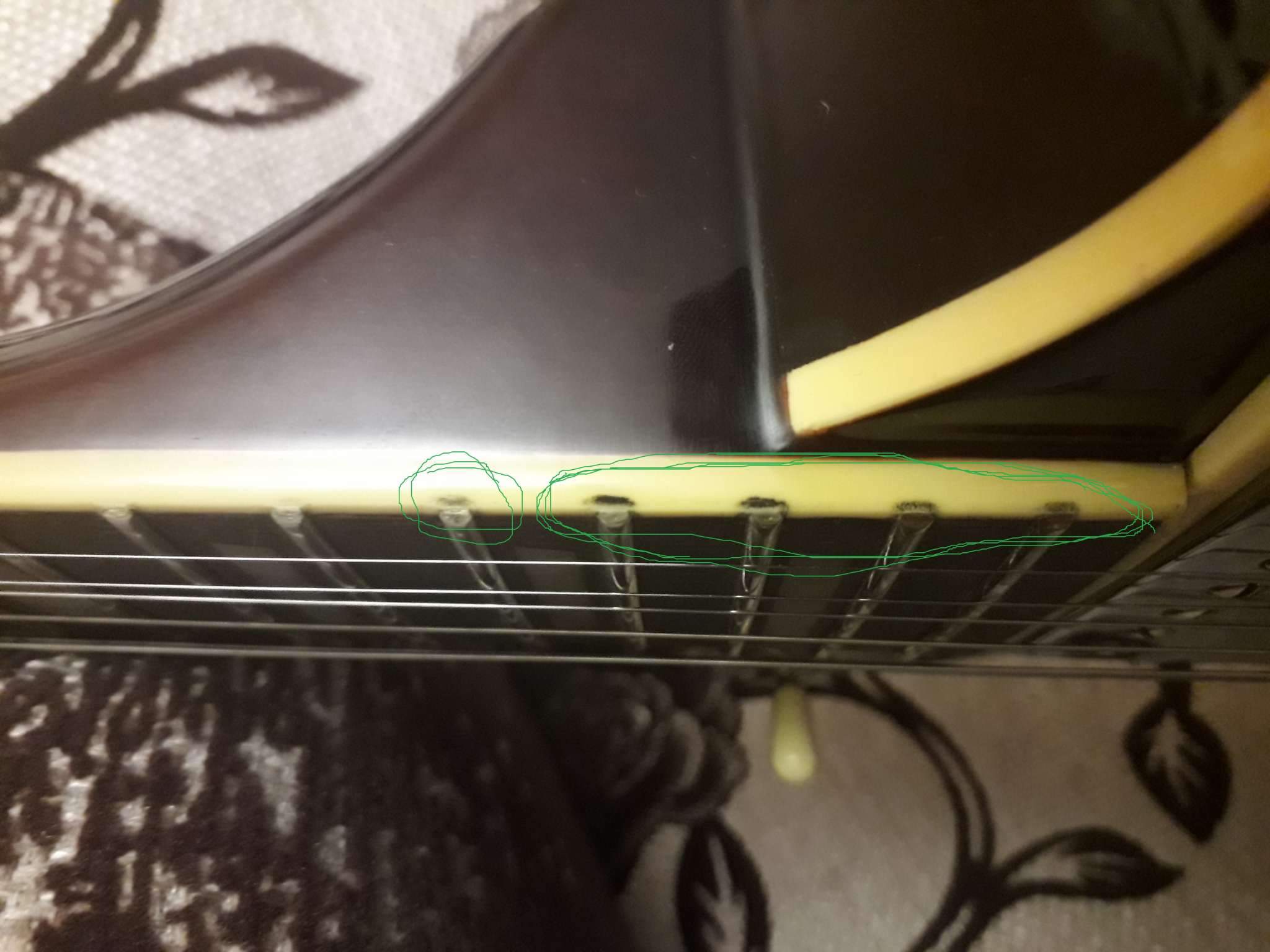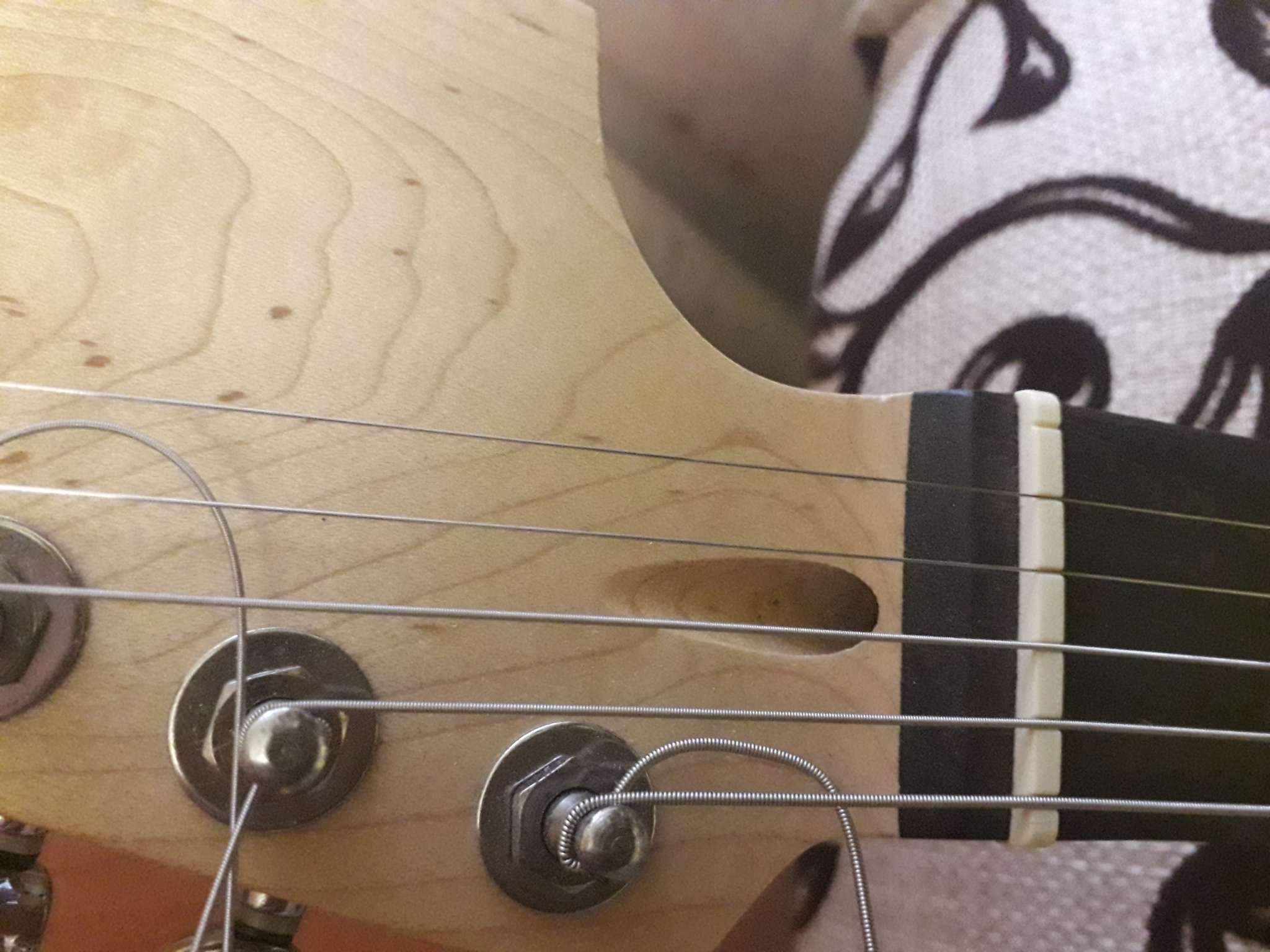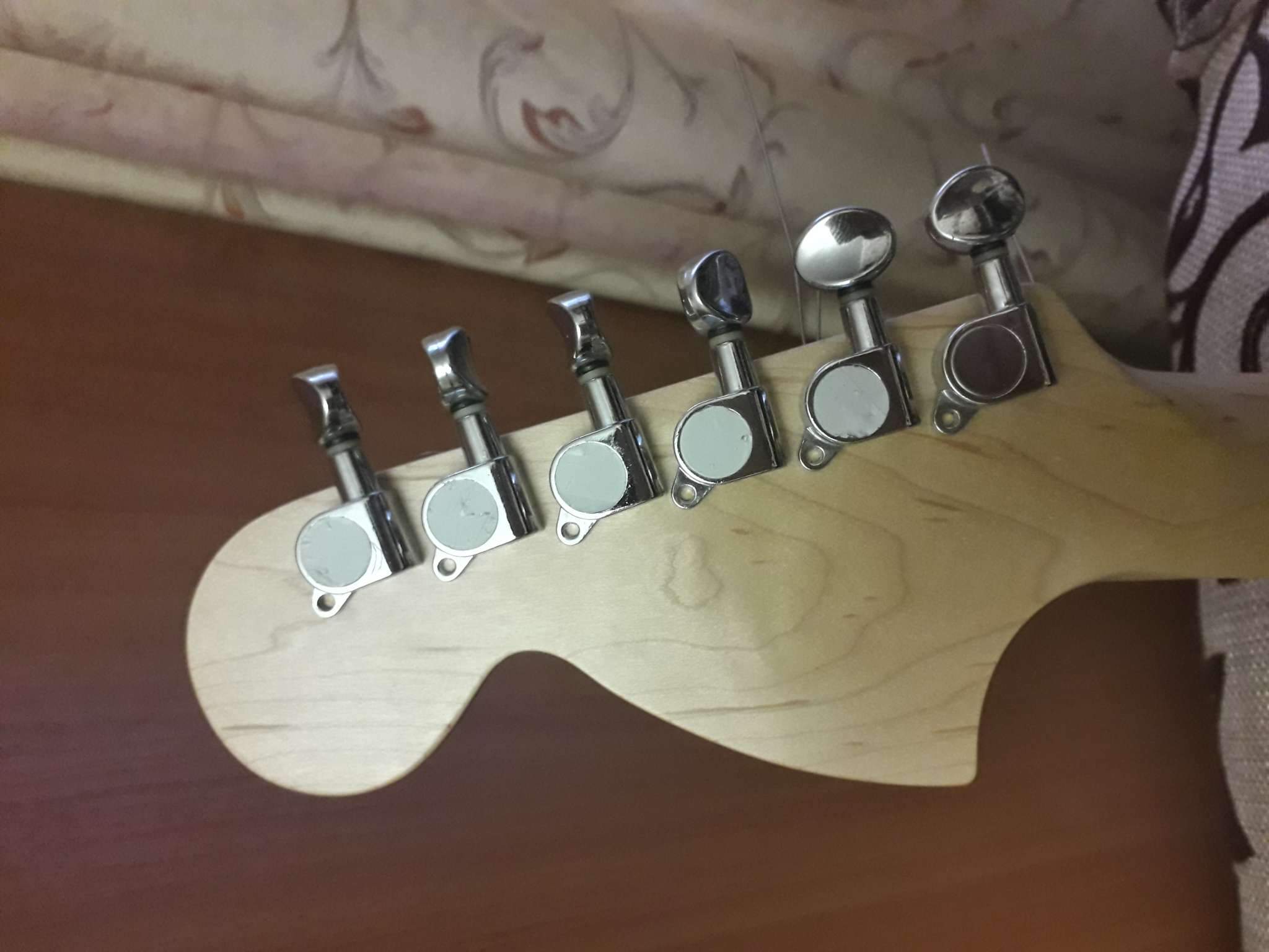Открыл коробку всё цело повреждений нет, осмотрел и тут вылезли очень неприятные моменты для меня!, колки прикручены криво! накладка вся в клею плюс клеем заделаны большие поры в накладке! залакирована пыль от шлифовки ладов на канте, едем дальше-на канте накладки грифа не хватает лака на накладке и у ладов ,что только нет помойка, лады обгрызаны тупыми кусачками зашлифованы но дело это не исправило, прогиб грифа чуть ли не в обратную сторону, на тыльной стороне грифа бугорок а за бугорком ямка пальцами чувствуется , под рамку звукоснимателя пролазит медиатр , расстояние от струны до струны 50 мм а звукосниматели стоят 53 мм как так непонятно! при подтяжке бенде струна становится между стержнями звучков , кант возле нека то ли в соплях то ли так залакирован ужасно((( ах да снял крышку анкера она сзади выглядит как будто её плавили зажигалкой а потом она на помойке валялась до установки на лаке пера остались следы от неё!!