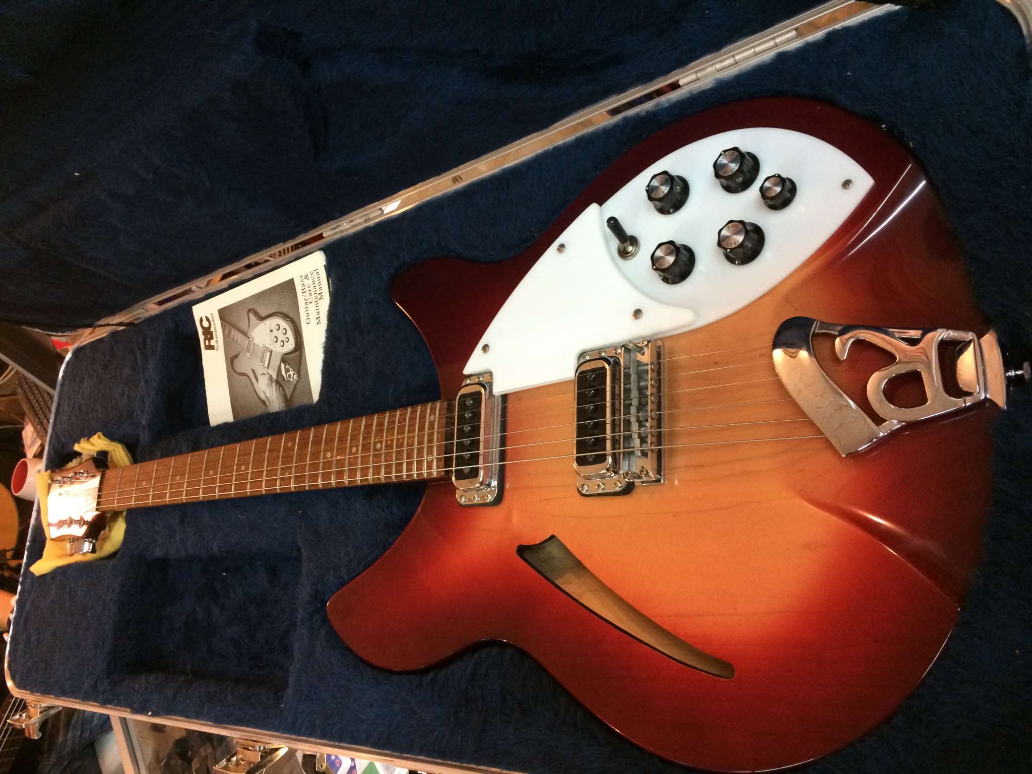 До кучи, хозяин решил повторить фирменную рикеновскую лакировку накладки поверх ладов