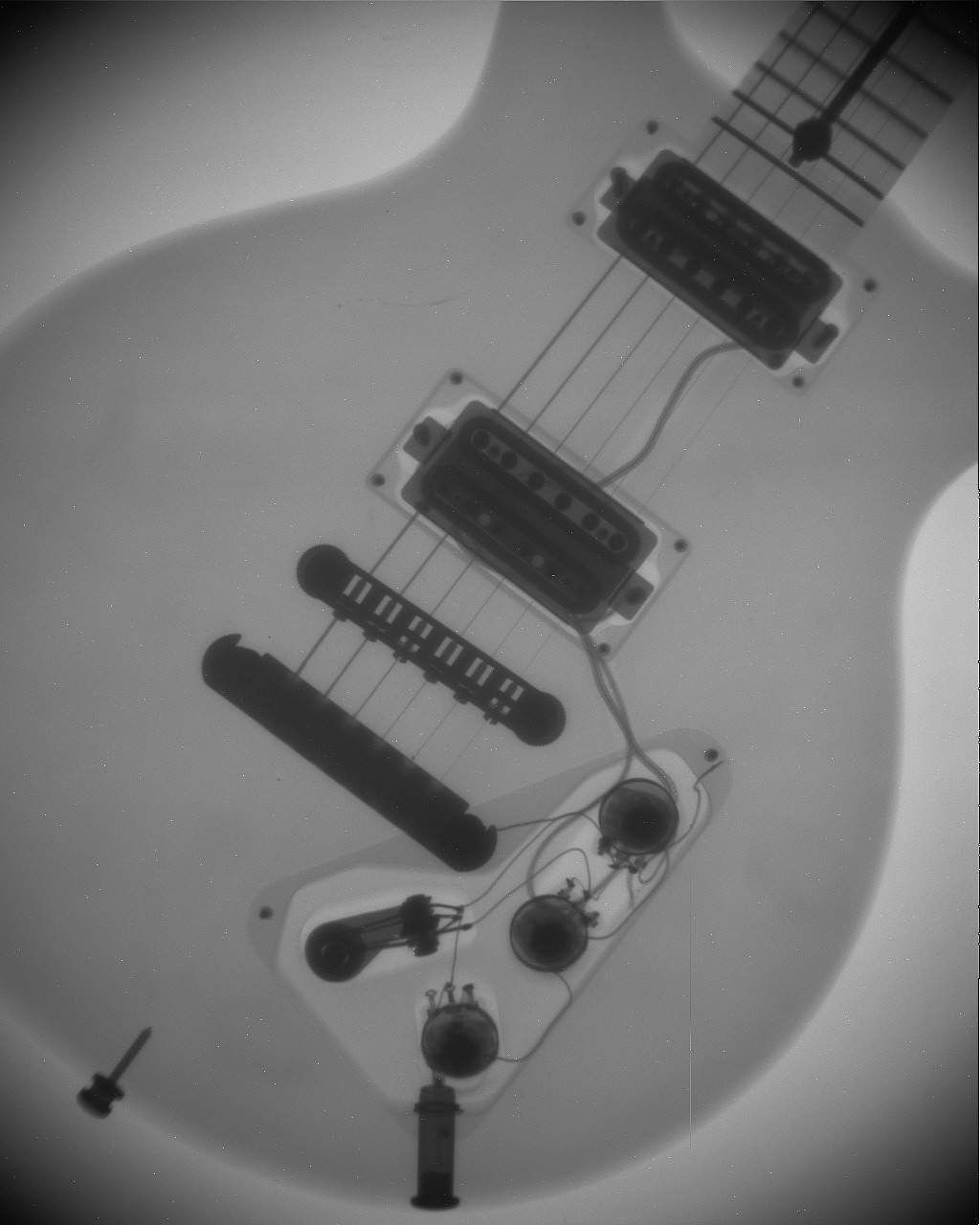 Дизайн. Внешне - обычный double cut, аналогичен Gibson LP DC и PRS CU22/CU24/McCarty с некоторыми отличиями в дизайнерском исполнении. Как известно эта гитара изначально именовалась Sunburst и как я понимаю, появилась несколько раньше, чем DC от Gibson и от PRS, а именно в 1977 году. Дека не толстая - всего чуть больше 5 см (2 дюйма) да и то в максимальной части выпуклого топа. Инструмент не имеет полостей или сыра - это в принципе изначально всем Хамероводам известно, но дабы устранить любые сомнения, я прилагаю рентген-снимок деки. Мне очень нравиться в ряд расположенные «крутилки» и так же считаю удачным расположение «туда-сюдашечки». Голова сделана в форме той же Гибсоновской «книжки», но сходящимся конусом, что лично мне нравиться не меньше гибсоновской головы с расходящимся конусом. Остальное в этой гитаре сделано в лучших традициях LP, что не удивительно, т.к. создатели этой фирмы Paul Hamer и Jol Dantzig были большими почитателями качества гитар Gibson, т.к. всё началось с выпуска разовых custom вариаций на известные модели Gibson Explorer и Flying V.