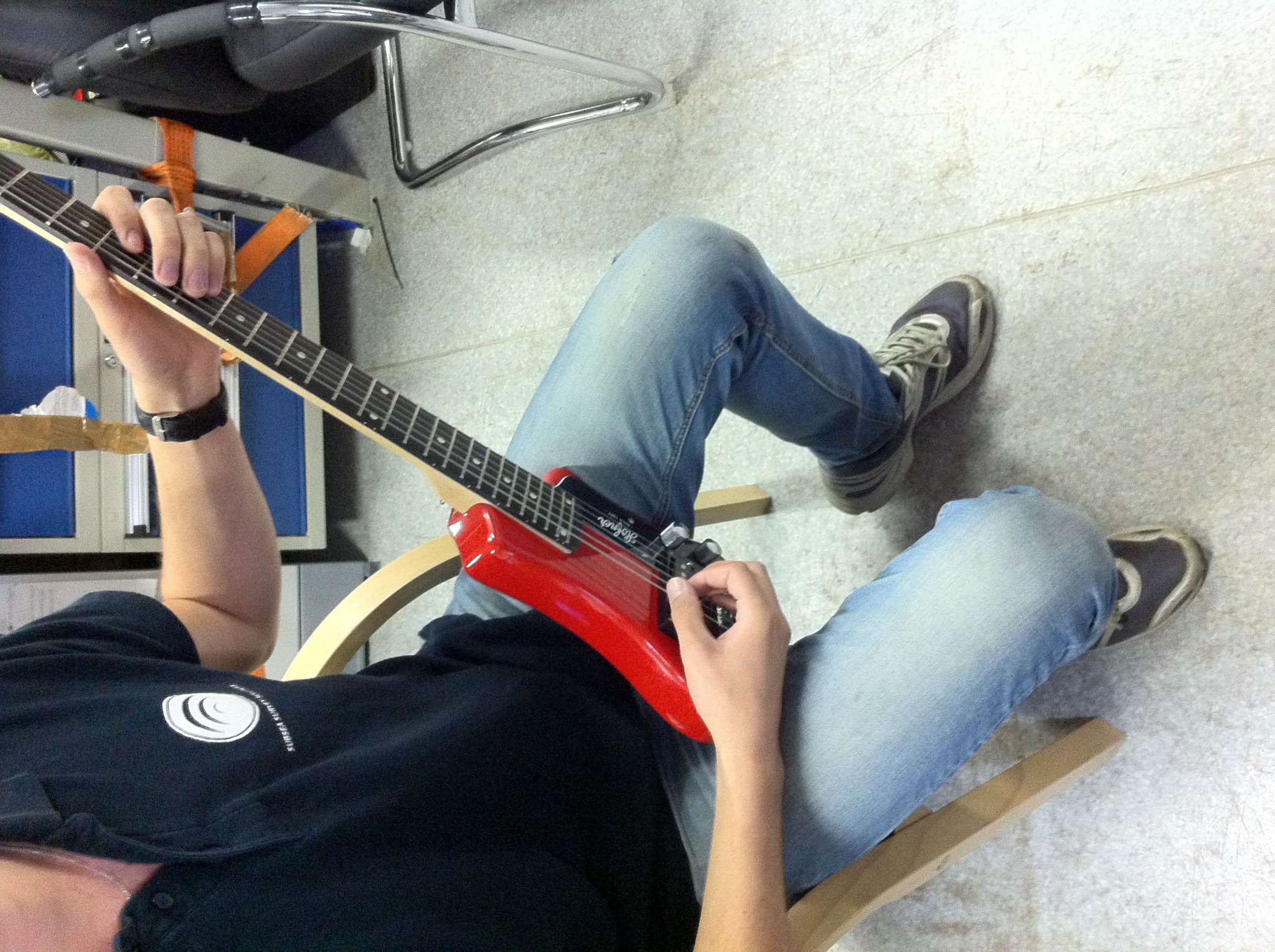 Из-за миниатюрного корпуса эту гитару не положишь на одну ногу как "полноразмерный" вариант. "Взрослая" гитара зажимается между ногой, грудью, локтем... в общем я не знаю как она зажимается, но лежит на ноге удобно, так удобно что я даже никогда не думал о том как она лежит. А эта "малышка", если лежит на одной ноге, так и хочешь клюнуть грифом или опрокинуться вперед. И только через пару дней занятий на ней, я нашел оптимальное положение этой гитары, ее надо зажимать между ног, фото прикладываю. Играть стоя удобно.