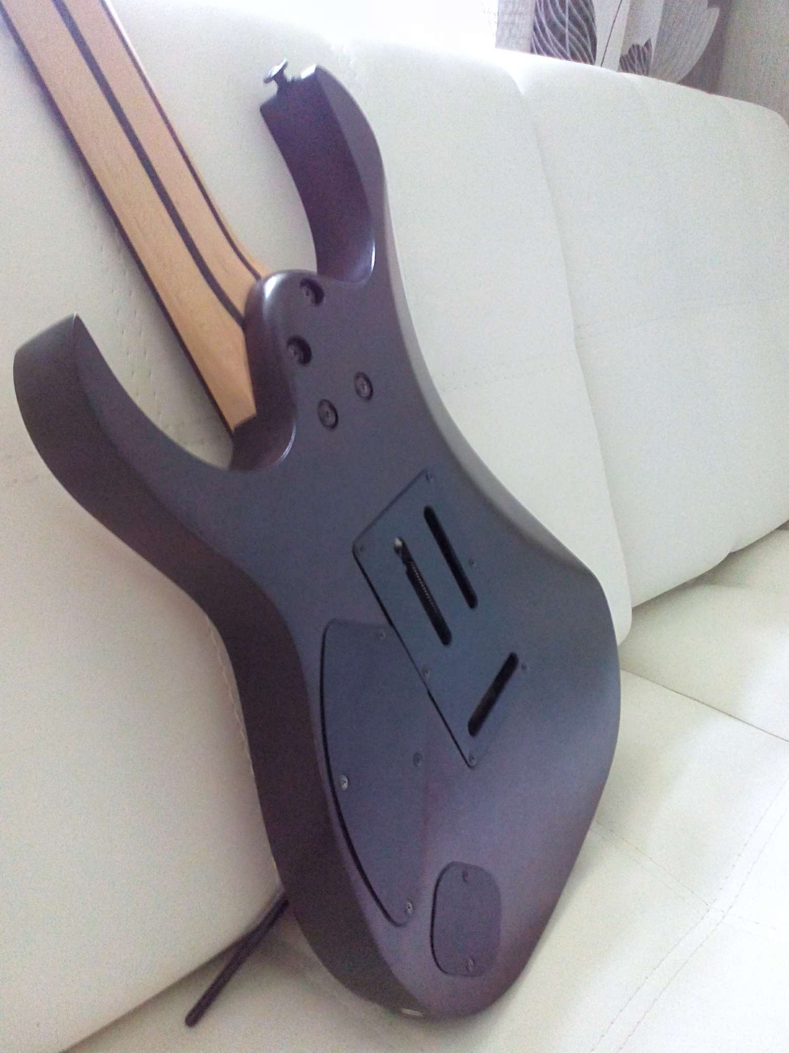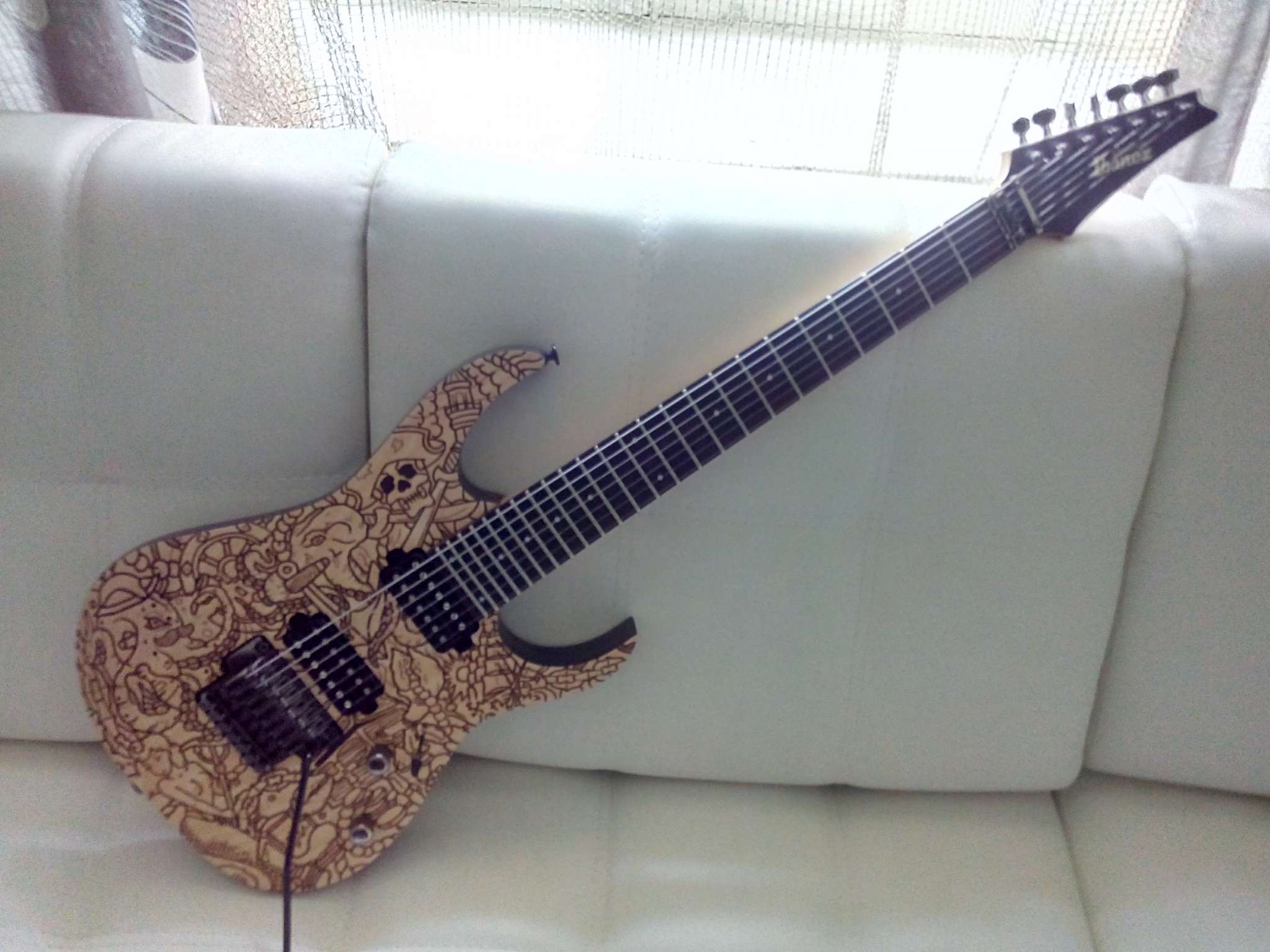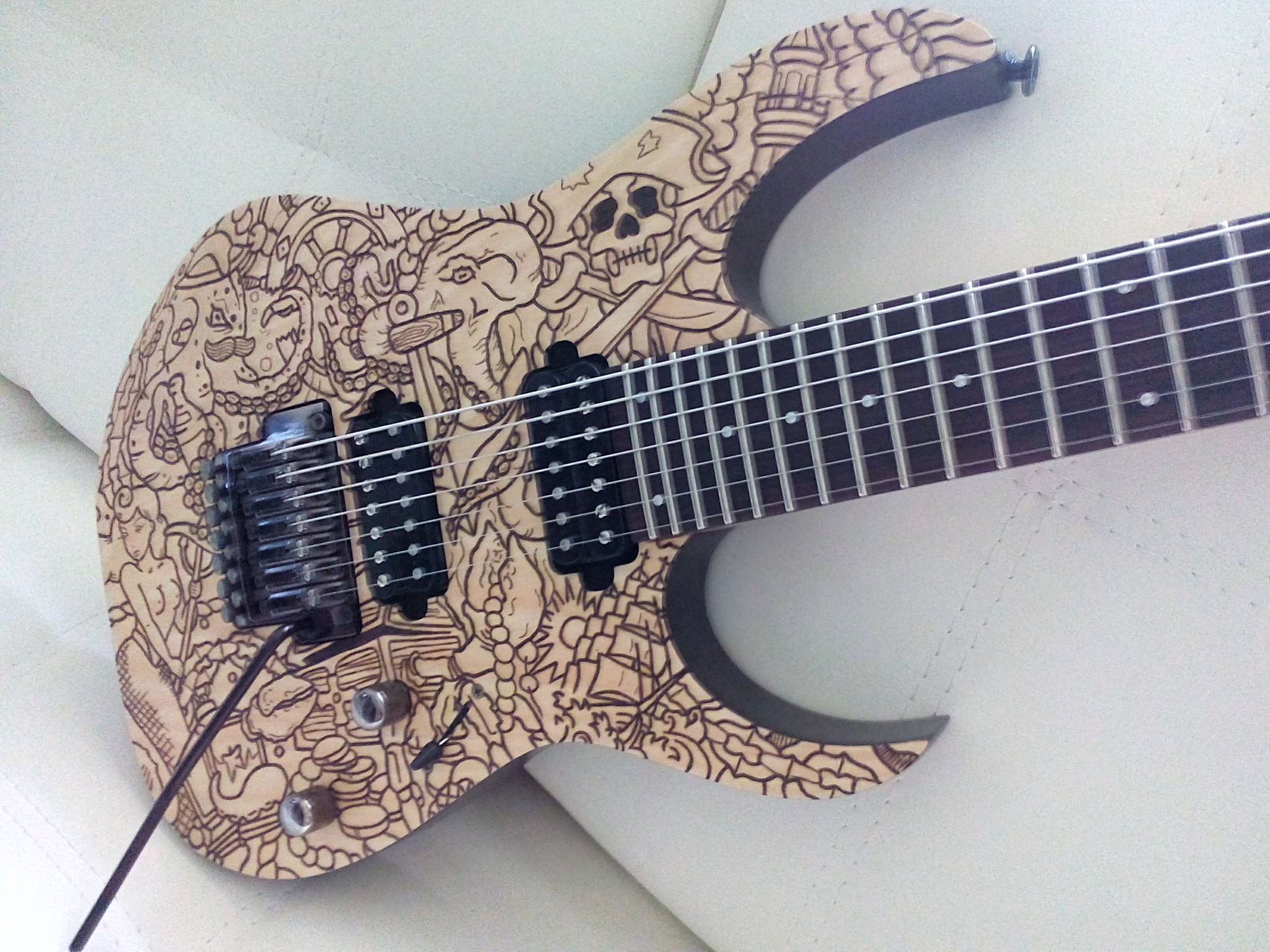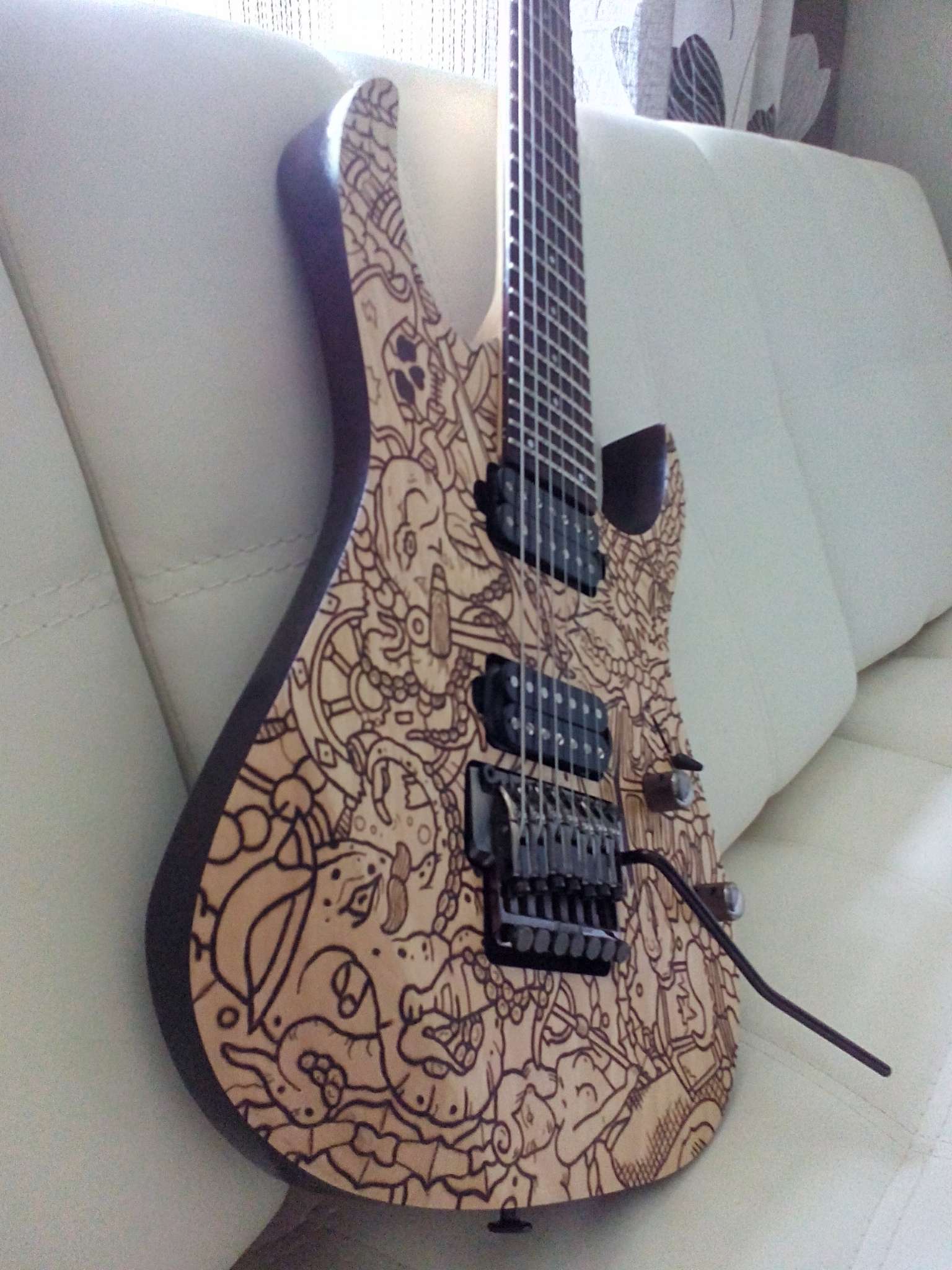 Выход: Берем в руки лезвие от канцелярского ножа и сдираем всё ЛКП с тушки! Берем пирограф и наносим нужный рисунок. Берем морилку цвета венге (под вставки на грифе) и покрываем ей тыл дэки. Вуаля!