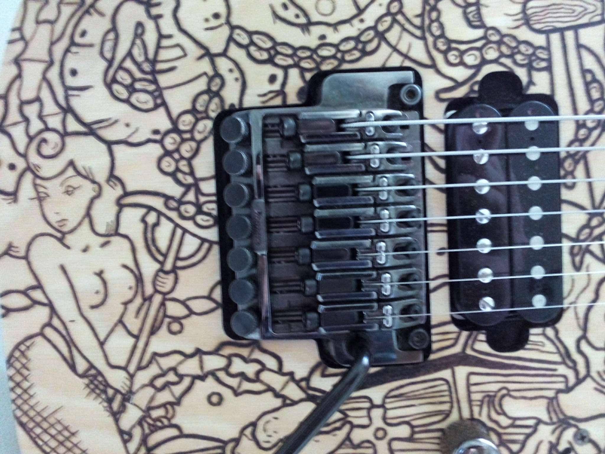 Качество сборки/изготовления: 9 балов.Все подогнано с настолько филигранной точностью, что аж противно. За 10 лет лады сохранились изумительно, вообще вся фурнитура порадовала. Колки от Gotoh крутились легко и непринужденно, топ лок отличный, потенциометры не хрустят, переключатель датчиков работает без проблем. Бал снял за стертое покрытие флойда, но на функционал это не влияет ничуть. Даже ножи на флойде были в идеальном состоянии, возможно его никто и не насиловал толком. Ниша флойда проклеена тонким черным паролончиком (мило!). Сама качалка уверенно держит строй, правда, после бомб приходиться качнуть рычаг слегка вверх, чтобы четко вернутся в строй, но это, как я понял, у всех так.
