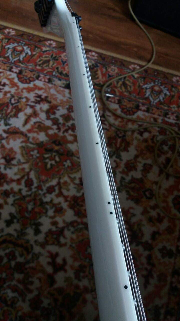 2)Накладка палисандр, как по мне эбони бы лучше смотрелась на контрасте с Snow White цветом и белыми плавниками на ладах, но это дело лично производителя и к весомому минусу отнести так-то и нельзя.