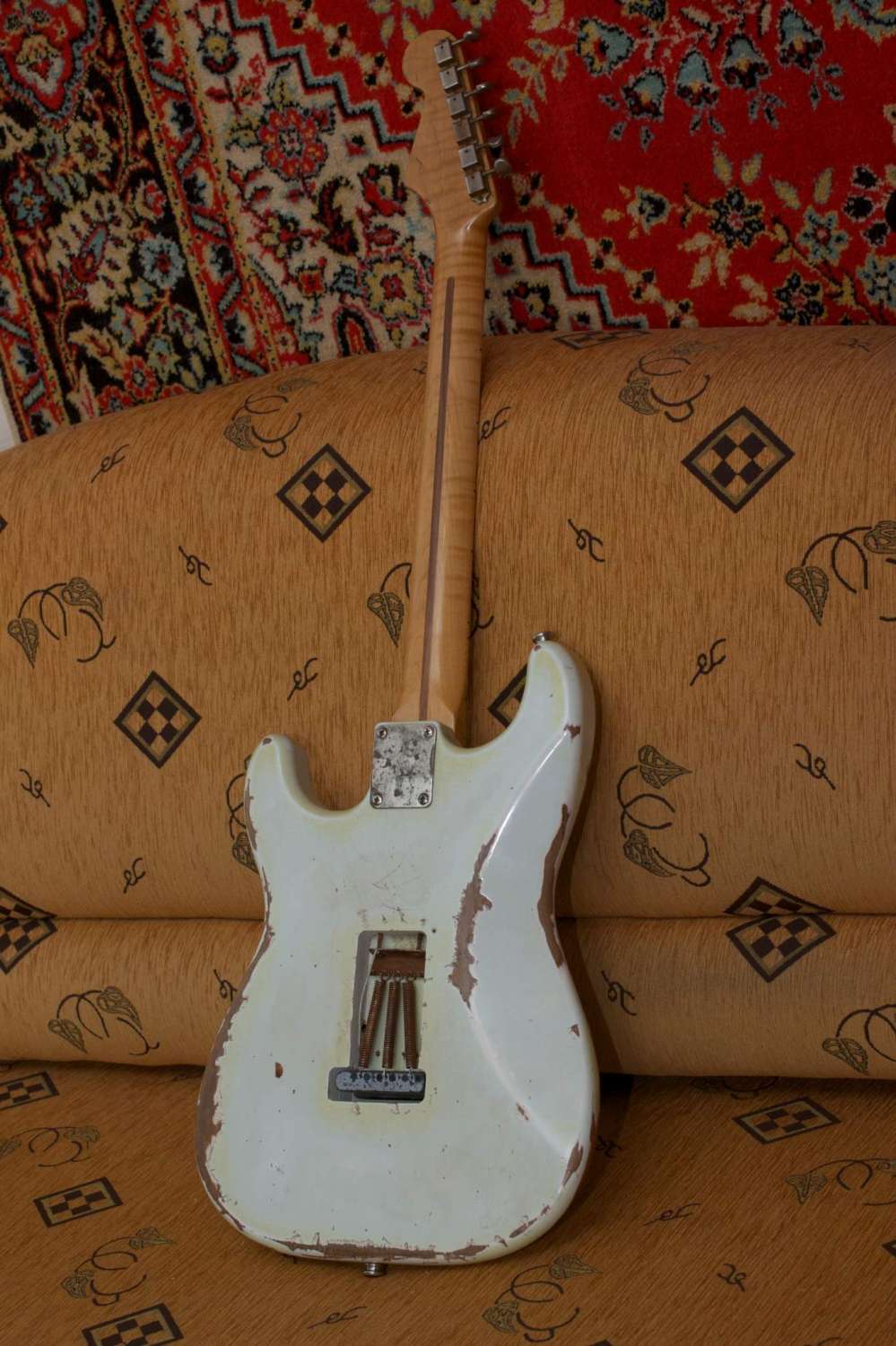 Данный инструмент был изготовлен Relic Depot ,по сути, не для продажи, исключительно для выставочных целей, как образец состаривания гитар (relic) и заодно для пробы термокедра в качестве материала деки. Никакого особого внимания к деталям фурнитуры , во многом я думаю - просто из того что было под рукой. Андрей (мастер) при очередной встрече просто предложил взять его на прослушивание. Я, человек давно не играющий на стратах, воспринял это предложение без особого энтузиазма, не ожидая услышать что-то новое. Бывало стратов у меня в руках много, от обычных американских и винтажных японских, до reissue и кастомшопа Fender - ну, как то не приживались они у меня. Послушав этот страт у себя дома, поиграв на нем с недельку, я был удивлен настолько, что решил оставить его себе. Это инструмент, на котором играю уже около месяца все свободное время и который не хочется выпускать из рук. В нем есть и стекло, и прозрачность, и атака, и сустейн, он практически невесомый и при этом не звучит как банка, ну и универсальность инструмента как такового - в общем, остальное скажут фото и сэмплы.