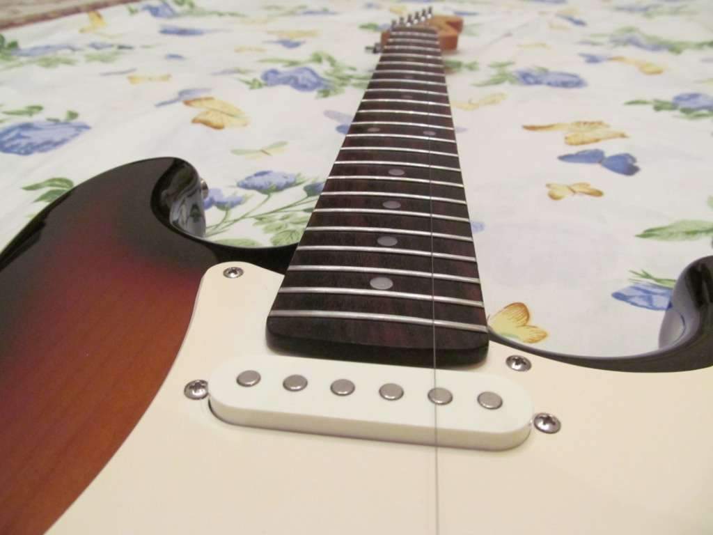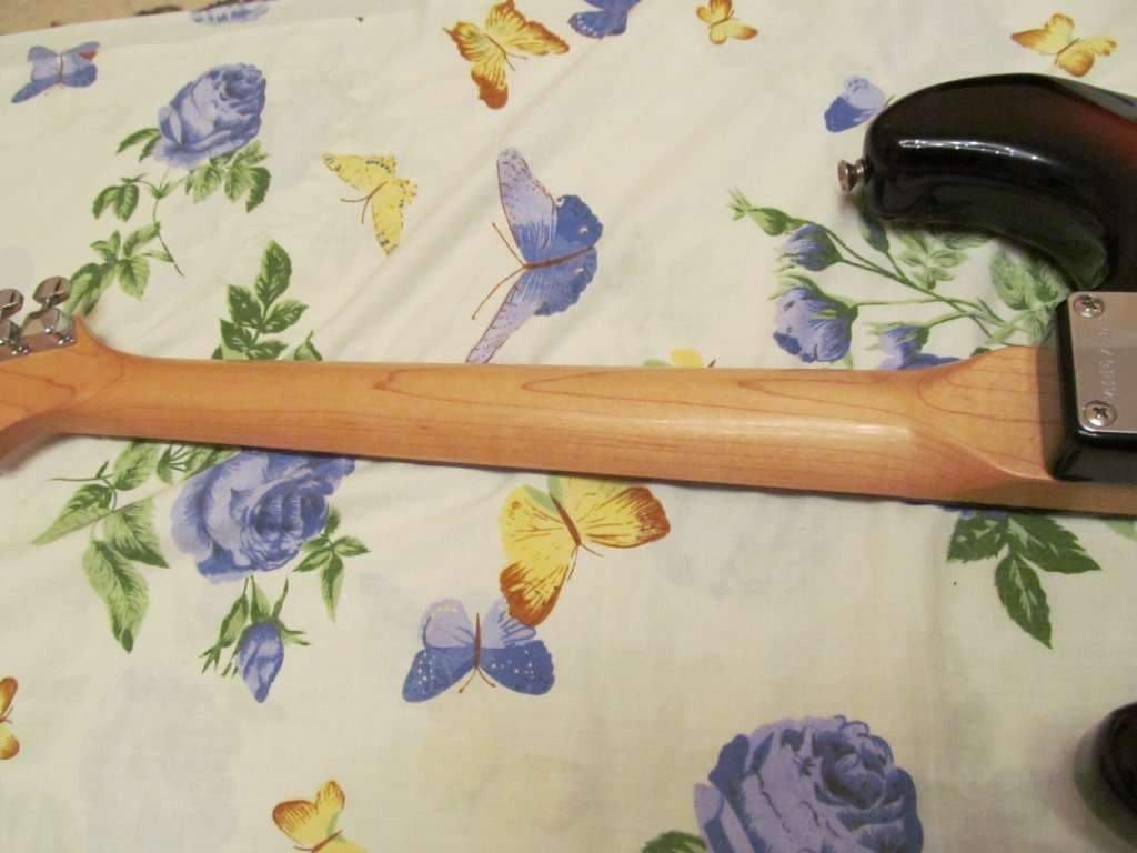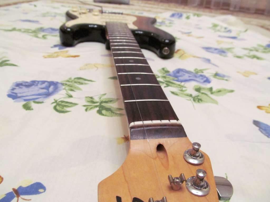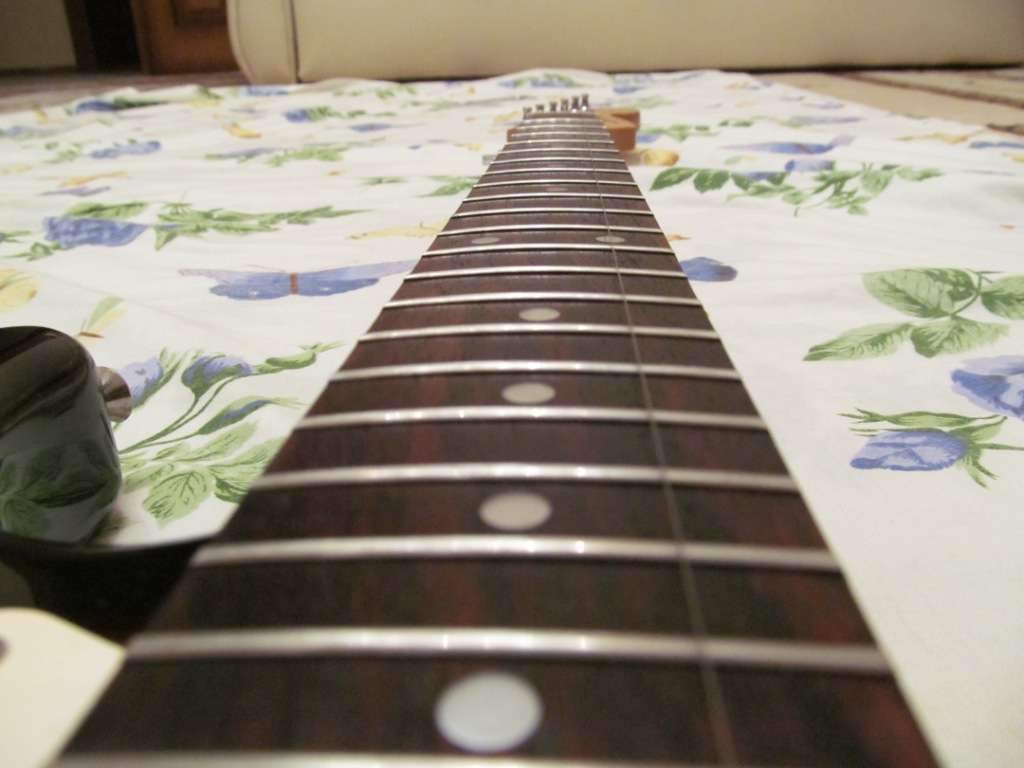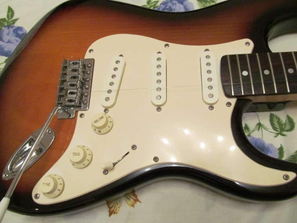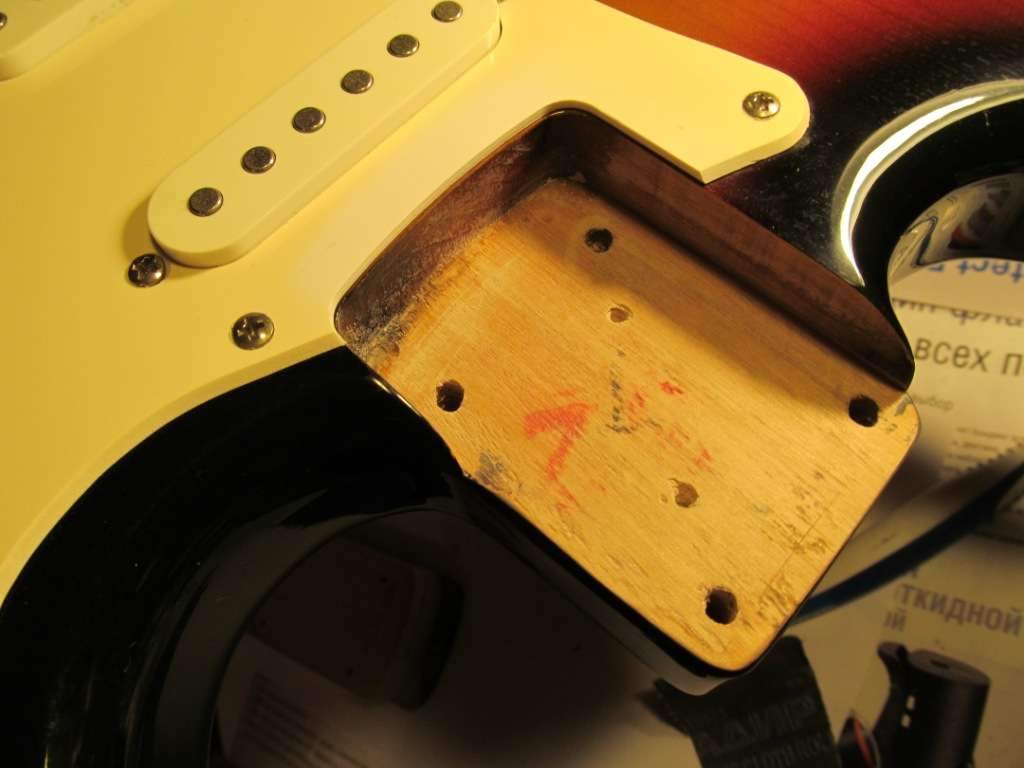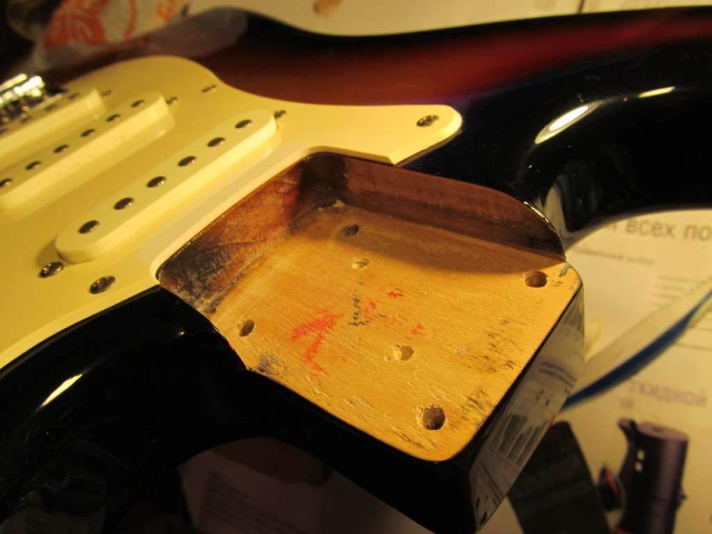 ). Дека- реально склеенная из 2-х кусков ( вроде бы ольха, может вы лучше разбираетесь – подскажите) . Кстати, толщина деки- как на настоящих Фендерах - 45 мм ( сам померял) , профиль грифа тоже толстый , фендеровский. Вся механика и электроника работают без проблем, все ручки регулируются, переключатель переключает, датчики звучат. Сборка качественная. Немного царапаются лады по краям грифа, но я так думаю что это из-за естественного усыхания палисанра, который в течении 20 лет никто наверное ни разу и не смазывал лимонным маслом. Хорошо хоть трещин нет. Больше всего переживал за гриф- но оказалось что и гриф ровный , и анкер регулируется. Очень рад, что за 20 лет гриф не повело винтом никуда. Видно, что гриф распиленный параллельно волокнам дерева. Лады почти без износа , канавок и вмятин, хотя сами по себе лады низкие и тонкие. Проверил ребром карточки- горбов и волн по ладам нет вообще, всё ровно закатано. В планах потом поменять лады на новые у мастера - повыше и потолще ( но не такие толстые как на Суперстратах) – хочу именно средние лады . Гитару ещё никто даже не разбирал на части ( это было видно когда я откручивал гриф от деки- посыпалось много стружки с отверстий- как закрутили на заводе так и там она и осталась ) . Фурнитура реально железная, колки и тремоло притягиваются к магниту. Пикгард тоже снял, под ним тоже порядок , никто ничего не трогал, пайка и сборка очень хорошая. Гитара внутри не заэкранированная.