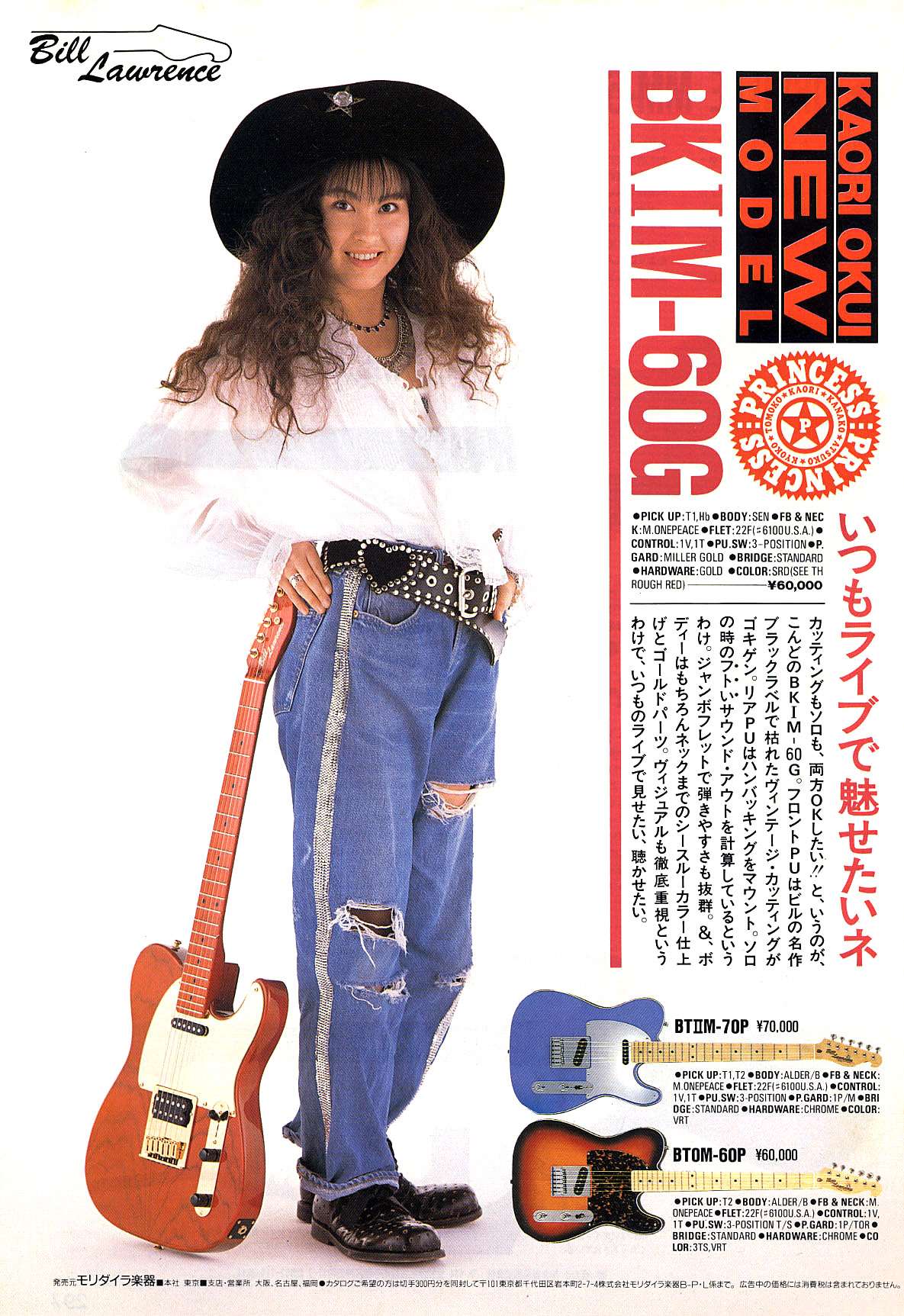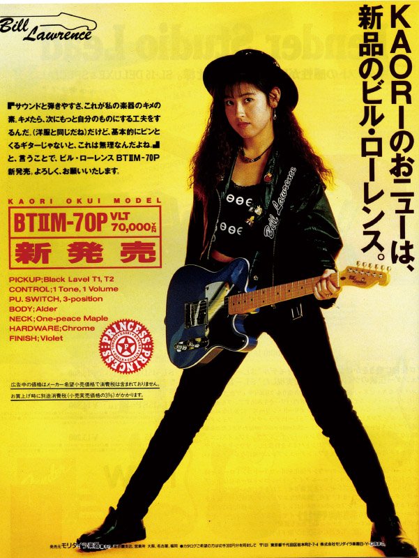 Кратко о модели гитары.Есть не достоверная информация, что фабрика Moridaira начала изготовлять свои электрогитары и басы под брендом Bill Lawrence с 1983 года, а до этого времени они выпускали электрогитары под другими брендами, такими как H.S. Andersen, Hohner и т.д. Одновременно с этим, в Японии появилась девичья поп-рок группа Princess Princess. Команда достигла пика популярности в Японии в 1988 году. Собственно в этом году появилась первая «именная» гитара для лидера этой группы – Kaori Okui, которая в последствии, породила целую плеяду «именных» гитар. Серия состояла из трех телекастеров, причем есть один удивительный момент, все были с кленовой накладкой и 22 «данлоповскими» ладами, но чуть позже появилась версия третьей модели с палисандровой накладкой. К слову, кленовые версии третьей модели, в начале 90-х, начали выпускать в трех расцветках, а именно прозрачный синий и прозрачный зеленый, помимо стандартного прозрачного красного.