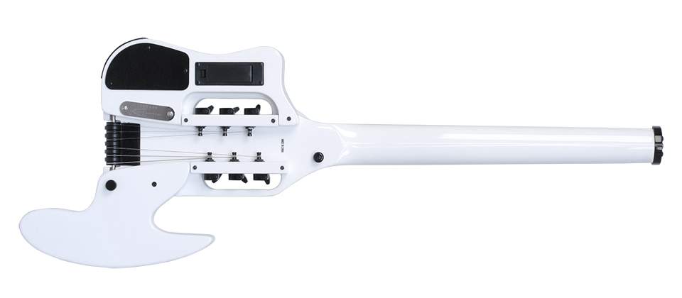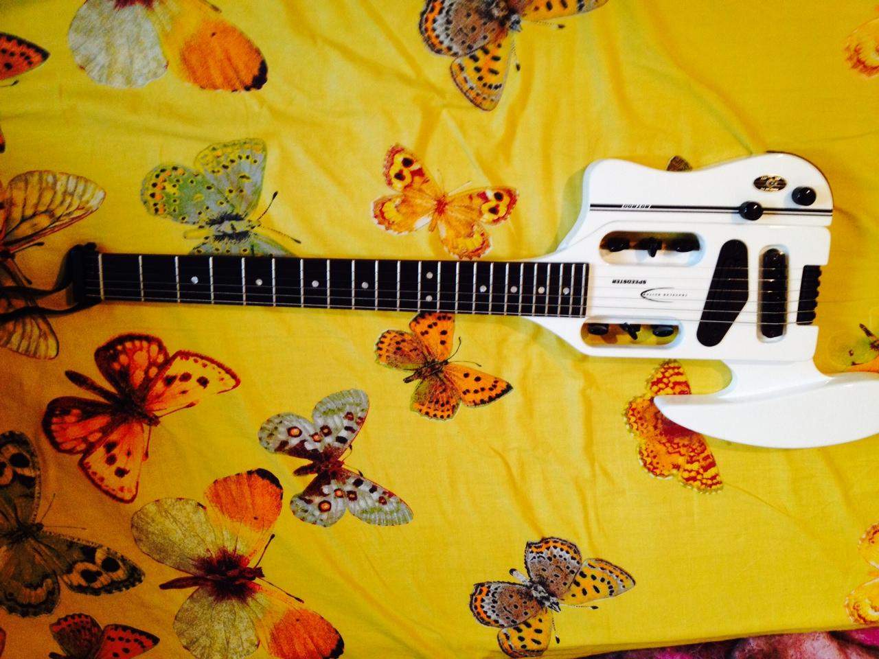 Во-первых, данная "палка" весьма компактна, подставка под руку откручивается и вся гитара умещается в специальных чехол, который чуть меньше и тоньше чехла от тенисной ракетки. Но не смотря на всю компактность, она обладает полным функционалом(и даже чуть больше), в сравнении с полновесным инструментом. То есть гриф - нормальный полный гриф, на котором 22 лада, мензура "24 3/4" и расстояние между ладами не меньше чем на моем Лес Поле, на нем можно весьма спокойно тренироваться и репетировать без ущерба для здоровья и каких либо "привыканий". А сама компактность добивается тем, что от грифа "оттяпали" голову, струны пускаются через гриф(в том месте где должна быть голова), огибают деку и крепятся сзади гитары. Настройка идет как бы внутри деки(на фото видно колки). Самое интересное, что струна проделывает такое большое расстояние, что купированные струны не прокатят(у меня лопнула 1 струна, я снял со своей 3й гитары и она не дотянулась:)) Плюс ко всему уменьшена дека, то есть, как видно на фото, по сути это гриф с звукоснимателем, точнее рельсовым мини-хамбом:)