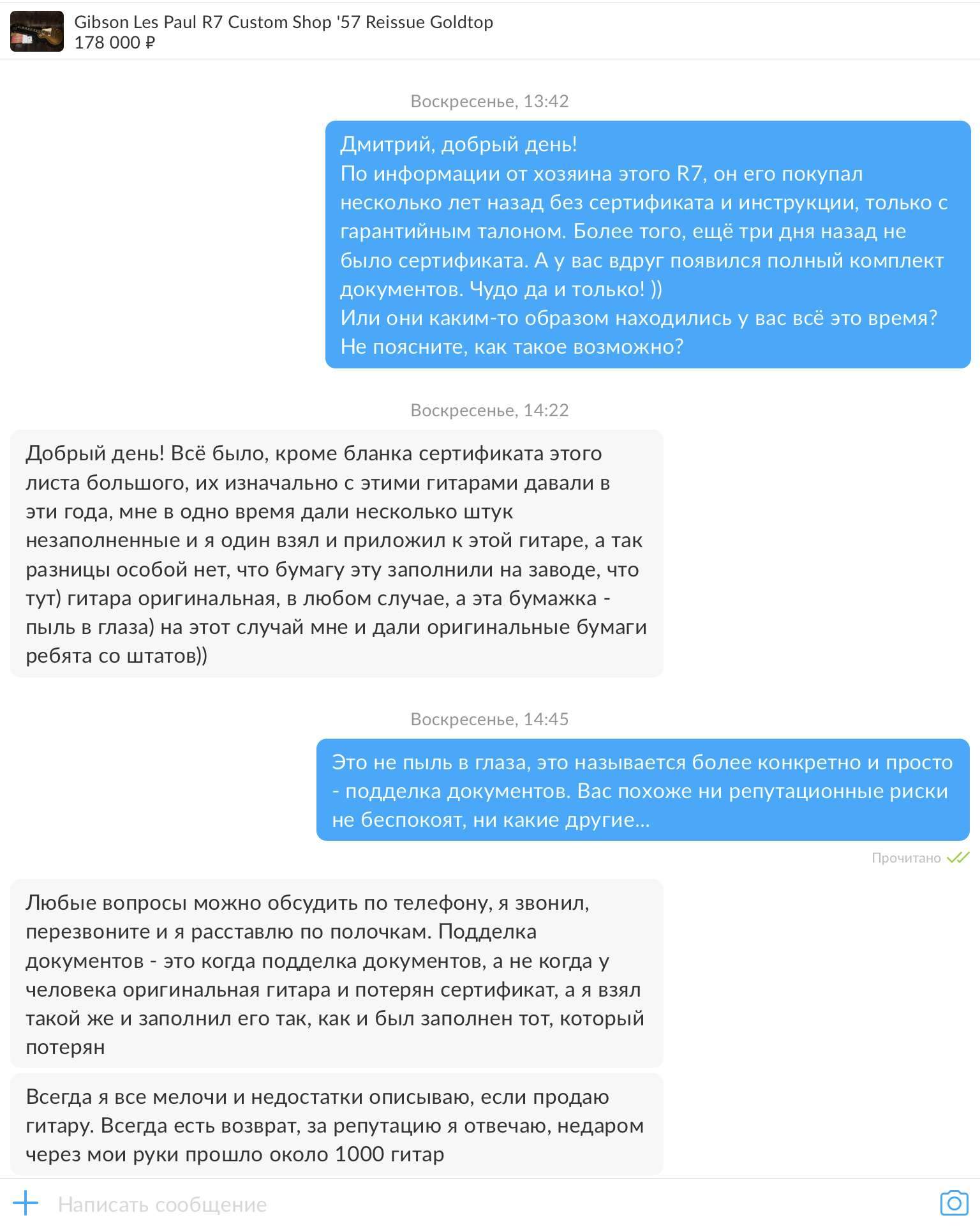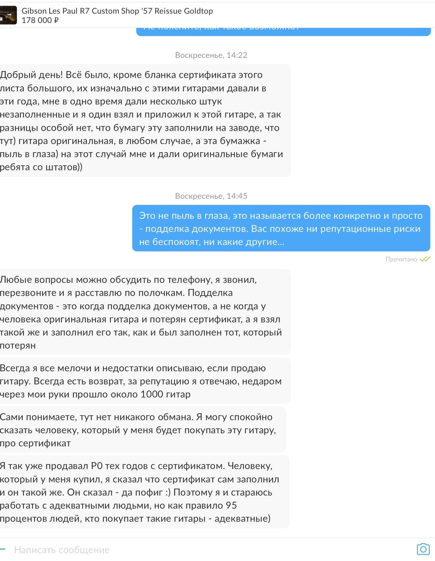 О боже) я так и знал что вы напишете, владелец этой гитары прованговал, когда я скинул переписку с авито эту) я же вам позвонил, а трубку не взяли, видимо у автора не было смелости объяснить мне это по телефону и решил написал на форуме, пожаловался. Мне человек принёс эту гитару чтобы я ему её продал, ибо не каждый готов продавать сам, за это я беру небольшую копеечку, не бесплатно же, но бизнесом это сложно назвать, ибо деньги, которые можно получить с гитар, даже на большую тележку в магазине не хватит. Гитара, кейс и все фантики оригинальные, я как человек, через которого прошло около 1000 гитар, могу сказать это с уверенностю. Пустой бланк под сертификат мне подогнали ещё лет 5 назад со штатов незаполненный, он оригинальный, а родной у автора был потерян, поэтому я решил так сделать. Эти сертификаты часто заполняют на заводе, иногда за пределами, например, в магазине, и всегда разным шрифтом. У меня уже была такая гитара и при покупке я рассказал про сертификат. Да и всегда у меня есть возвраты и всё такое, хотя причём тут это... Вообщем, автор из тех, кто никогда не скажет в лицо, а пойдёт и пожалуется. Мне сказал владелец, что вы хотели обменяться эту Р7на Хамер, но после адекватной доплаты или отсутствия бумаги, слились, хотя сейчас отметили что гитара хорошая и сертификат не проблема, видимо сейчас увидев её на продаже, стало жалко её) Я каждую неделю по гитаре продаю и все довольны, когда недовольны, наверное, 1 процент из всех, я делаю манибек и всегда о всех недостатках говорю до, а если совсем незначительные, то при просмотре.