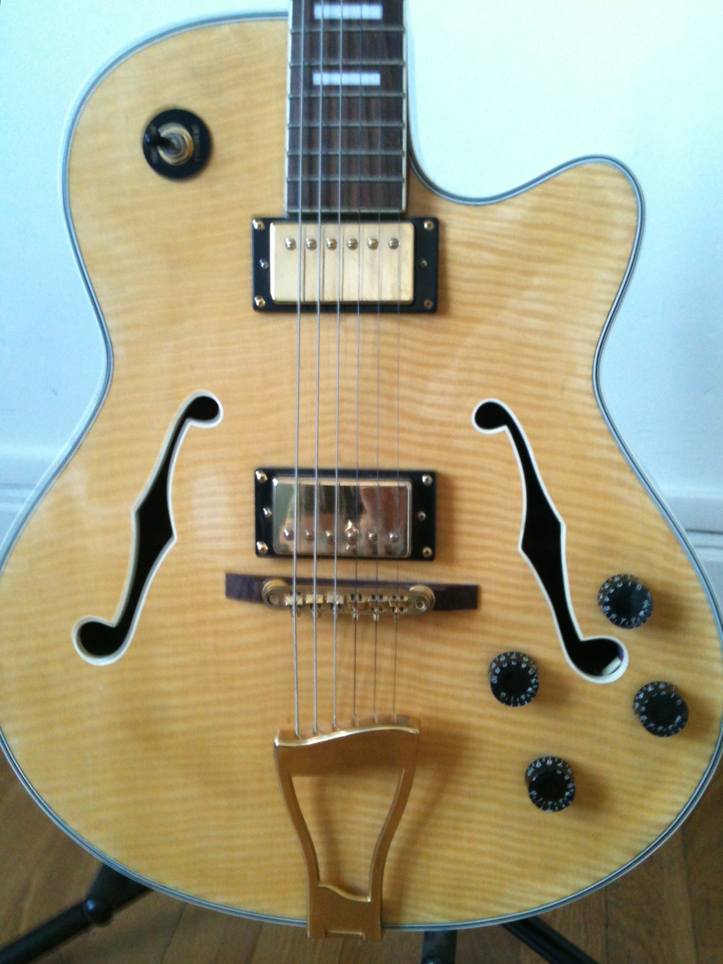 Лого металлическое, приклеенное. Провода, ручки, порожек, пикгард и накладки — меняли точно, причем довольно кустарно. Насчет звукоснимателей и железа в целом сказать ничего дельного не могу.
