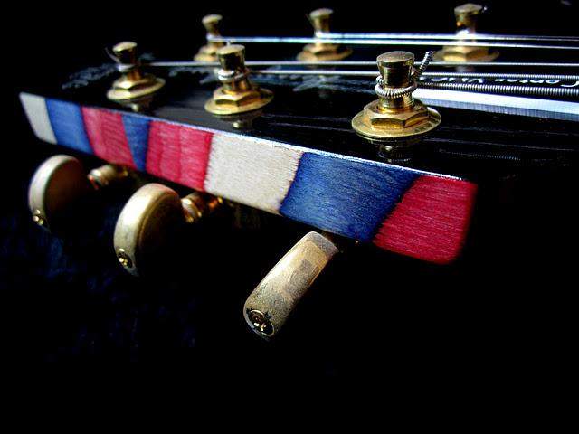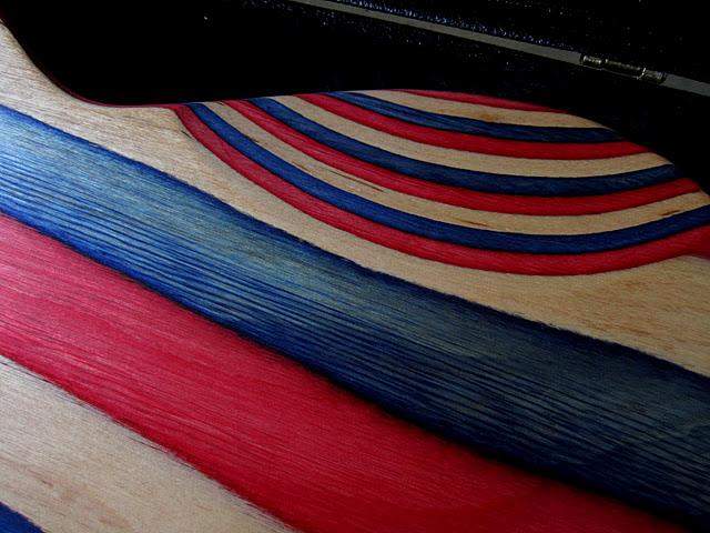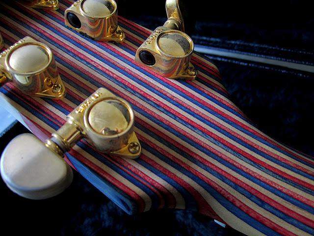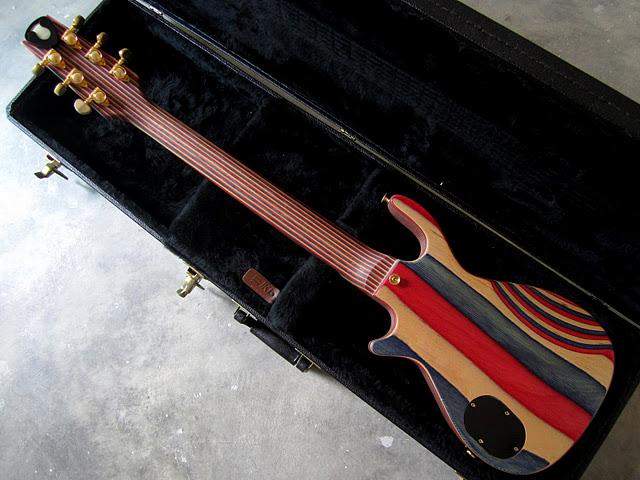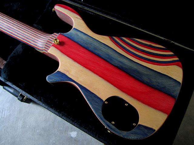 The wood is the amazing part of this story. It is similar to maple in density but more water resistant. It is used in high end firearm stocks, archery bows, and for some military applications. Thin slices were soaked in vats of dye until the color filled the wood. The slices were then glued together. The laminate block was then cut at an angle to give the striped appearance. The neck itself consists of over 30 laminates. Note in the control cavity that the dye is completely through the wood.