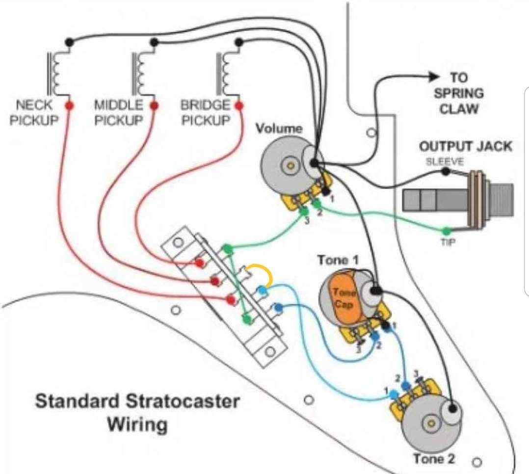 Интереснее нэшвилловская. Это когда у тебя позиционник меняется с пятёрки на тройку. 1 - бридж, 2 - нек и бридж, 3 - нек. Одна ручка мастер громкость, вторая мастер тон. А третья ведёт миддл сразу на гнездо. То есть последним потом можно подмешивать противофазный миддл к любой позиции и любыми порциями.