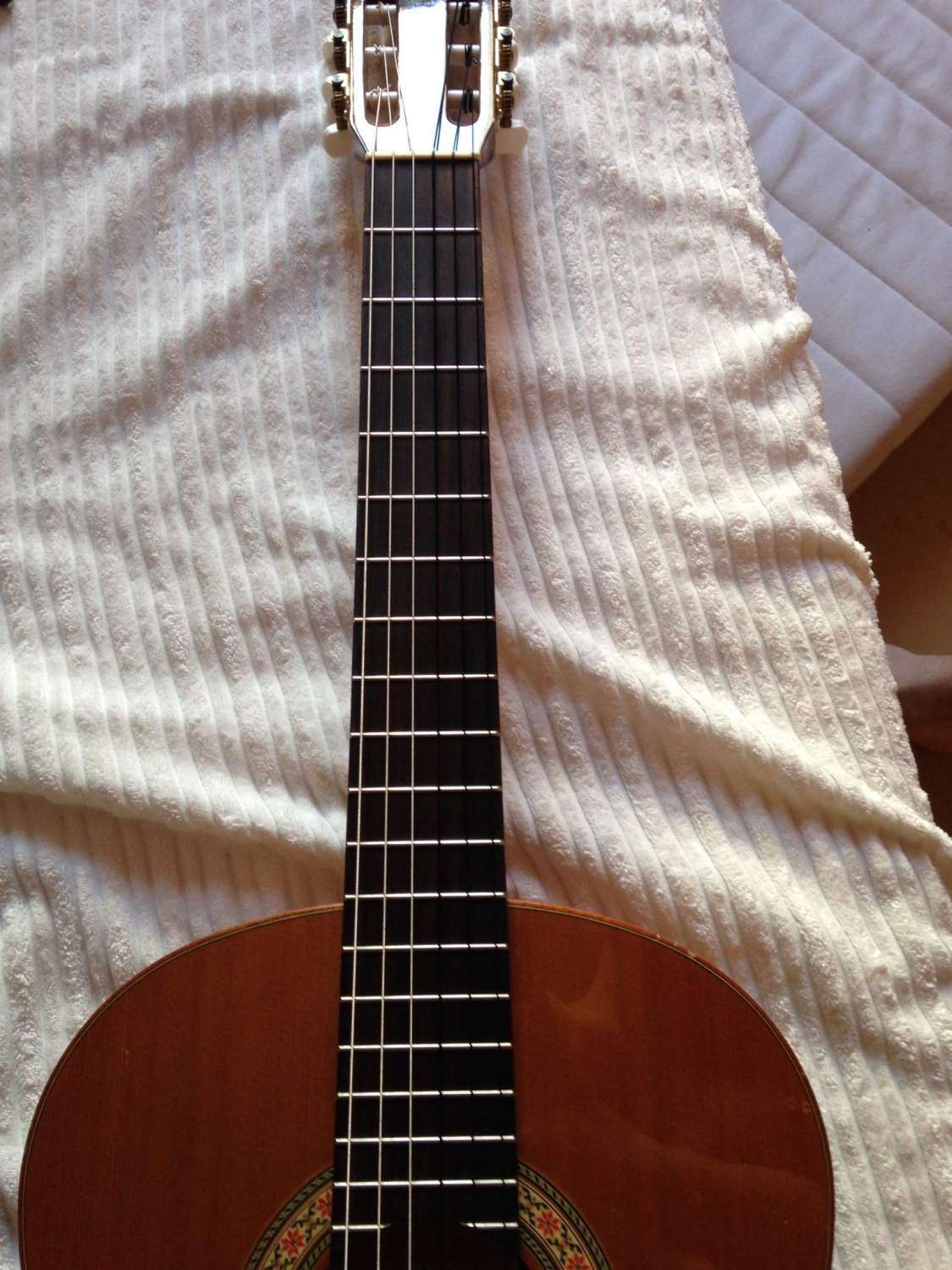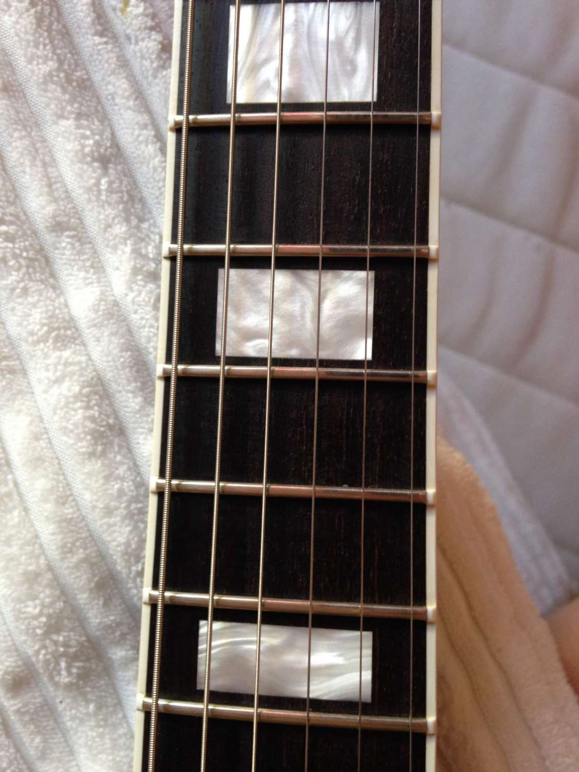 Началось все с того, что оказалось мол палисандровая накладка на кастоме - не тру, ибо нужно черное дерево. Смотрится черное дерево красивее - не поспоришь, а про звук такого не скажешь: и тот, и тот нормальный. Менять накладке из палисандра на черное дерево (цена вопроса 10 - 12 тысяч) не хочу, поэтому попросил мастера протереть гриф лимонным маслом после полировки ладов - интересен был результат. Первый два дня наклада была чуть темнее исходной, но потом все вернулось к исходному светлому цвету. Поэтому вариант просто протереть наладку маслом - отпадает. Покраска всякими эмалями и прочие извращения - тоже: жалко гитару.