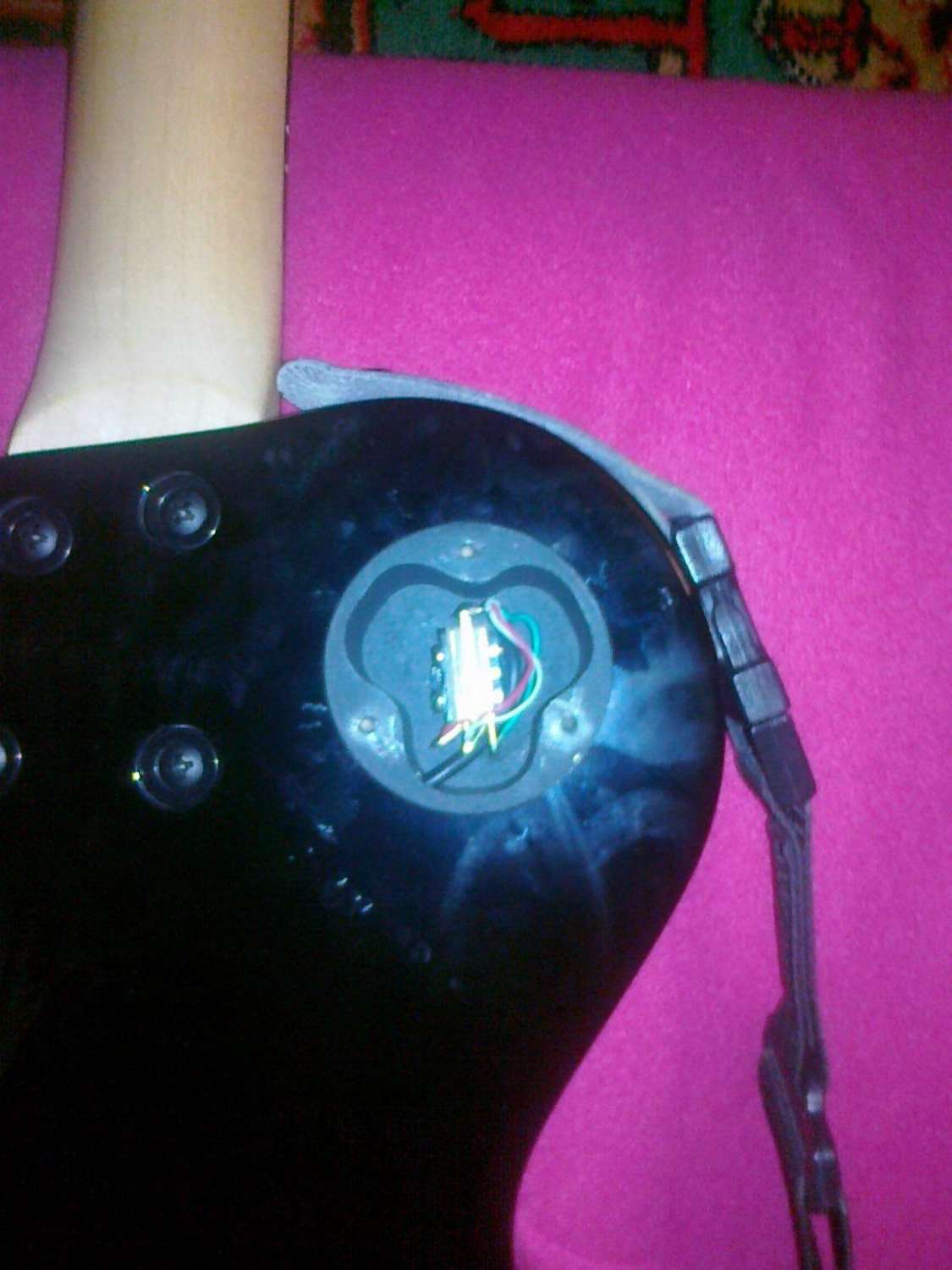 Когда играешь с перегрузом, то шум, естественно будет не сильный, а проявляться он будет в паузах. И еще. На моей гитаре устроено так, что когда рука касается какой-либо из струн, фон исчезает, а когда струны ни с чем не контактирует, то фон появляется. Возможно на твоем бриджеке наоборот, так что менять распайку.