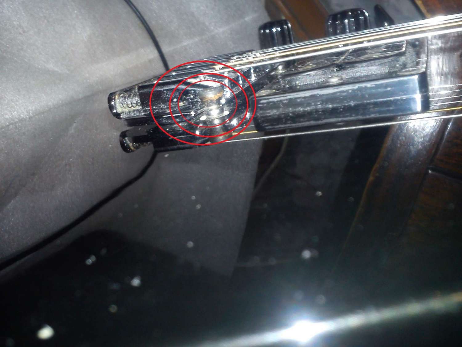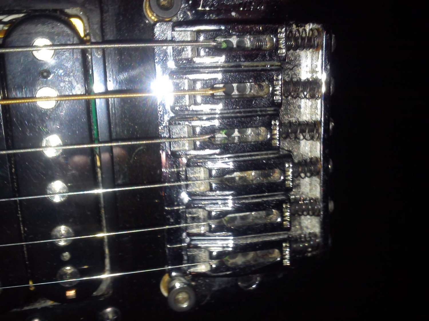 Потом я решил ещё покрутить машинку там где пружины. Покрутил, всё равно как ни крути трещало. Выставил обратно, чтобы была параллельно грифу. После этих манипуляций у меня 3, 5 и 6 струны начали трещать даже открытые