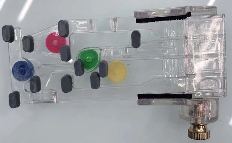 Спасибо. Синопсис: хреновина прикручивается на гриф и при нажатии на кнопки прижимает аппликатуры аккордов C (зелёная), D (красная), A (жёлтая) и G (синяя). Предполагается что т.о. ребёнок у которого нет сил прижать струны всё-таки сможет играть этими четырьми аккордами и даже каким-то образом их выучит. OMG, купите же ребёнку укулеле сопрано!