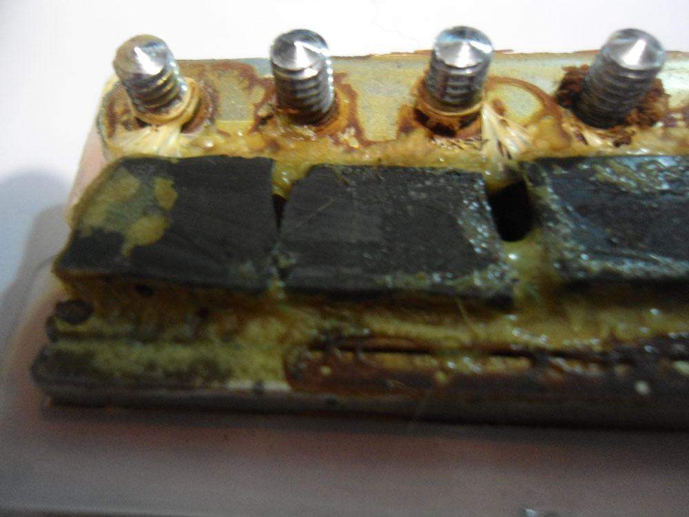 В эту неприятную клейкую массу были вбуханы 2 катушки, со сваливающимися, рыхло намотанными витками провода. Идиотские кусочки ферритовых магнитов - такое впечатление что их нашли на помойке. Чудовищный, как будто выпиленный руками похмельного ПТУ-шника, магнитопровод. На этом фоне 6 болтов с никелированными головками кажутся чудом секретных технологий)))