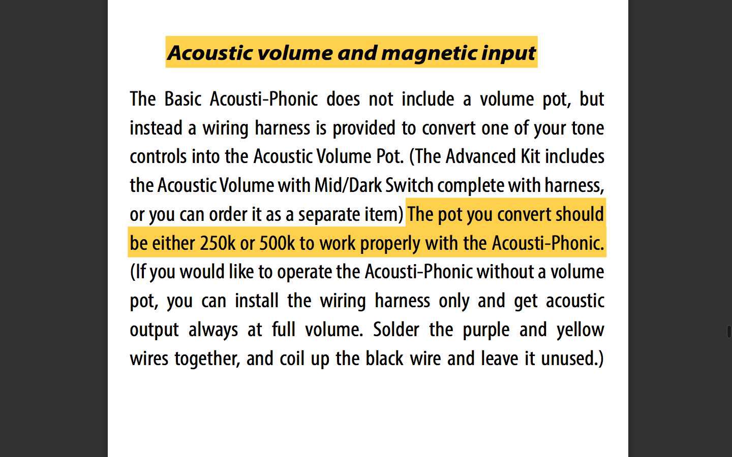 Активная схемотехника, благодаря большой нагрузочной способности, позволяет использовать потенцы в 25кОм без всякого влияния на звук, при этом любой бОльший потенц работает точно также хорошо, но, как писал выше - даст немного больше шума, что не обязательно будет заметно на слух. Пассивная схемотехника отличается слабой нагрузочной способностью, поэтому требует высоких значений сопротивления потенцев, даже до 1МОм в случае особо-высокоомных датчиков (когда мотают по 50кОм очень тонким проводом и огромное количество витков). По итогу - в случае смешанной схемотехники, когда потенц работает и для электромагнитного датчика и для пьезы и после активного преда в зависимости от положения переключателей - выбираем максимально высокое требование источников. Например: Актив - 25кОм, пьеза - 250кОм, электромагнитный хамб - 500кОм. Ставим - 500кОм. Лично я на своих инструментах нередко использовал 250кОм с рядом хамбов (повторюсь - чем ниже сопротивления датчика, тем ниже ему можно поставить потенц), что либо, вообще, никак не влияло на звук, либо несколько "съедало" немножко верха, что на слух воспринималось, как более "теплое", менее "колючее и ядовитое" звучание. Таким образом - в таких смешанных схемах рекомендую пробовать 500 и 250кОм на свой собственный слух и вкус.
