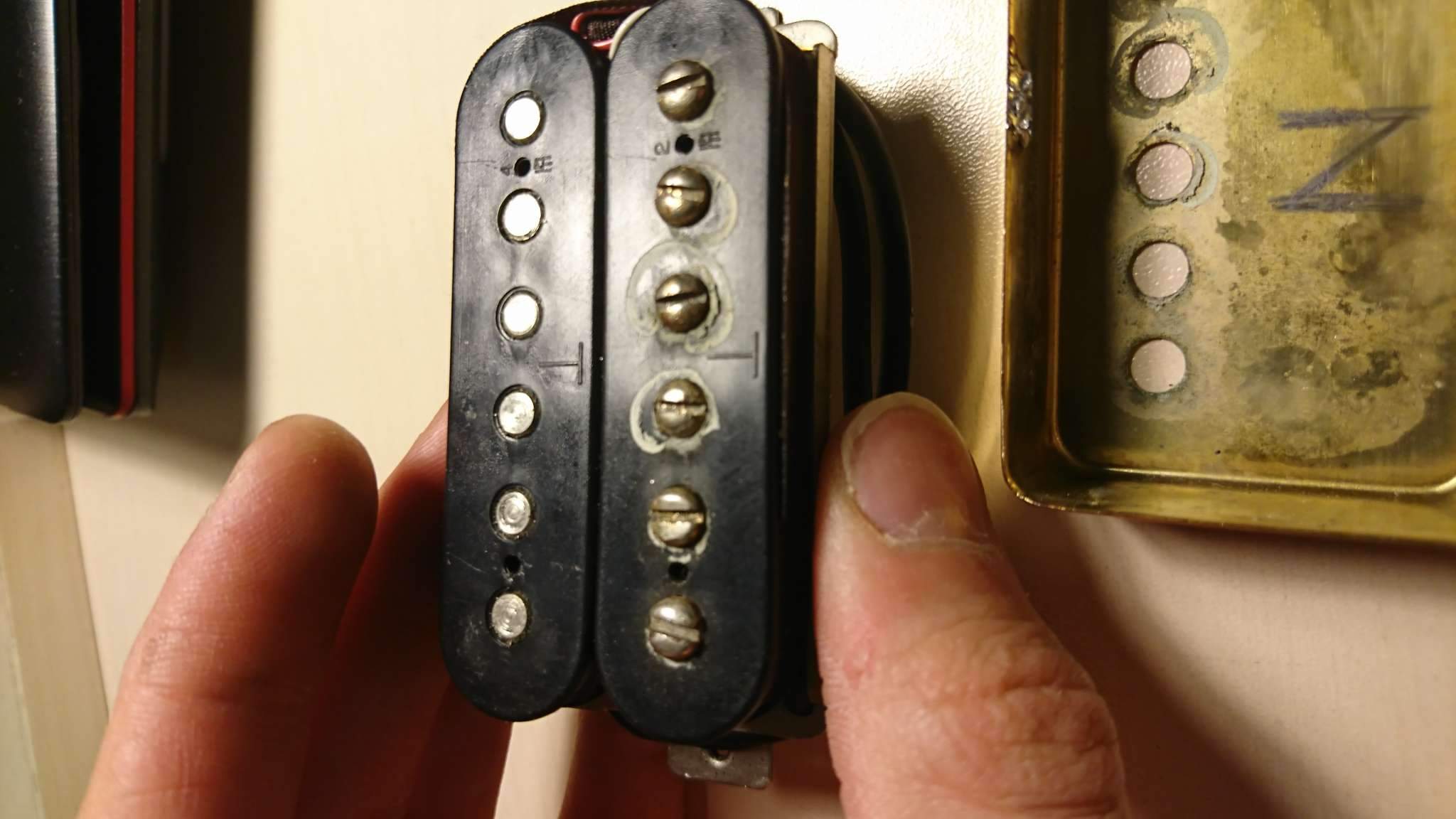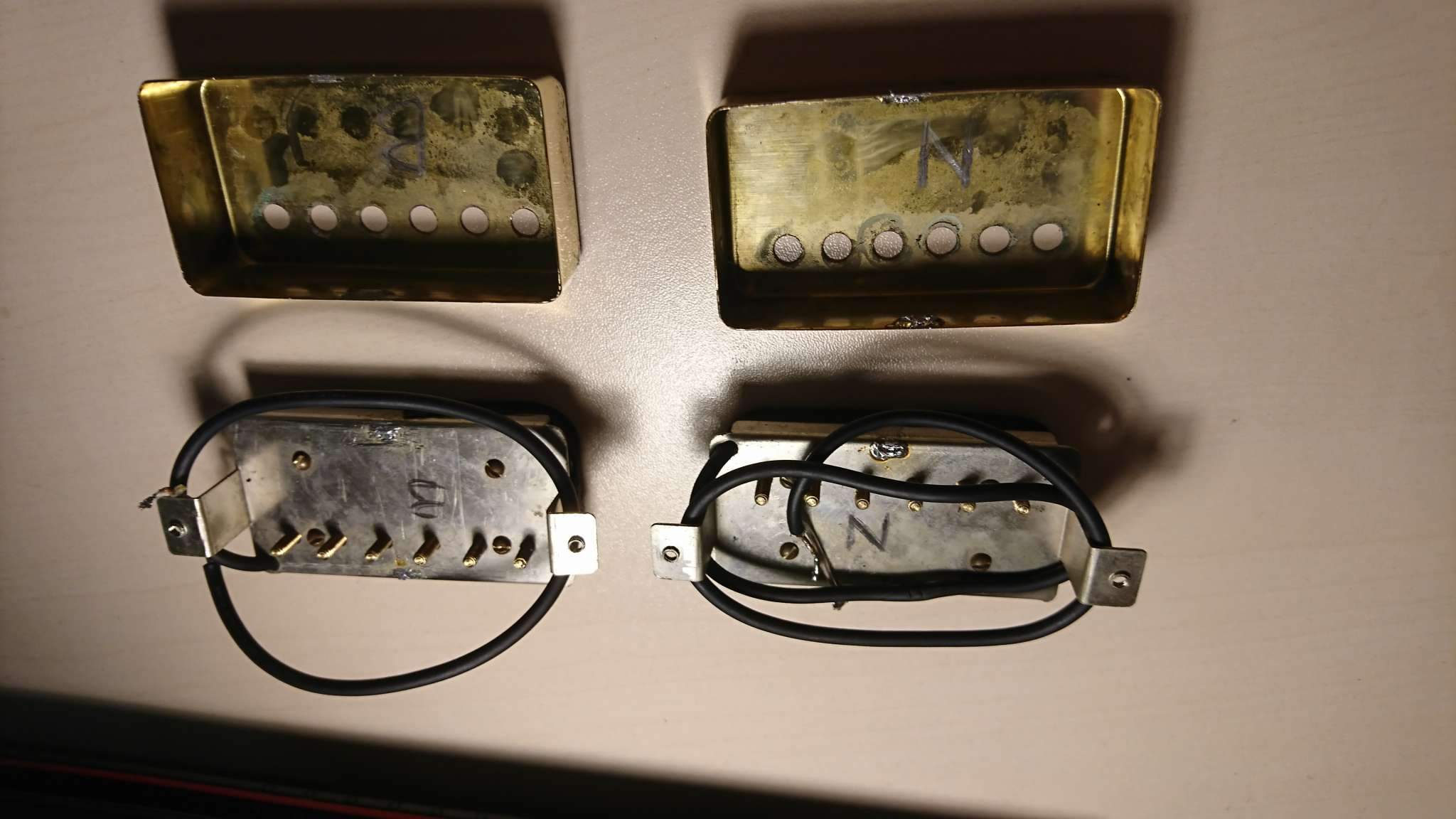 В закромах у деда обнаружился корпус от старой электрогитары, а на ней вот эти датчики. Хотелось бы о них узнать, хоть что-нибудь. На бридже надпись h1, h3 на разных катушках; нэк - h2, h4. На обоих катушках по большой букве Т. Мне кажется старые японцы. Благодарю всех откликнувшихся:)