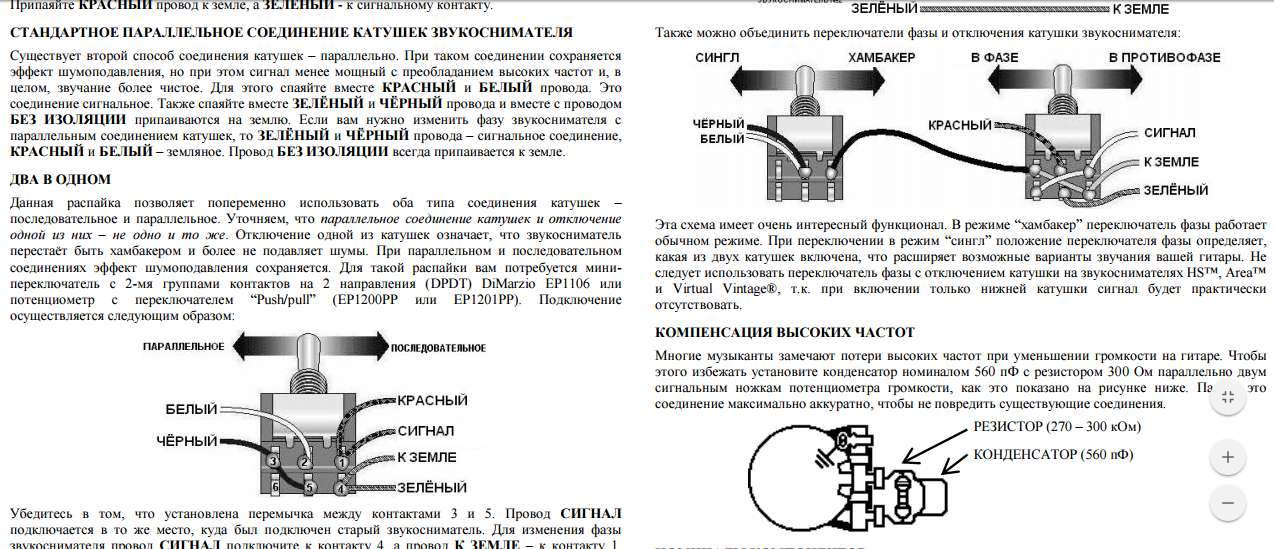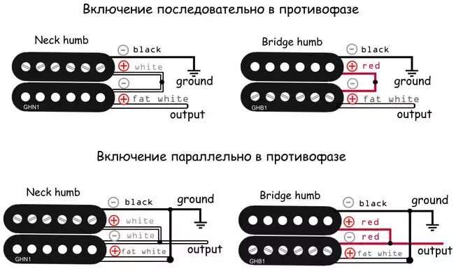 Использовал хамбакер с хромированной крышкой (я у нее вырезал вверху прямоугольник, чтобы не было короткозамкнутых витков). У него катушки разных сопротивлений, для более плавного перехода хамбакер-сингл для сингла оставляется катушка с большим сопротивлением (которая с регулировочными винтами), у нее чуть громче звук и чуть меньше ВЧ, чем у второй катушки (с цилиндрами). Сравнивал и так и так практически, сингловый звук для этих целей чуть лучше у катушки с винтами. И при регулировке в таком случае нет уж очень большой разницы в громкости и ВЧ, но характер звука меняется сильно. Несомненно, принцип хамбакера RWRP должен сохраняться, а также сигнал берется изнутри верхней катушки, земля - снаружи нижней катушки.