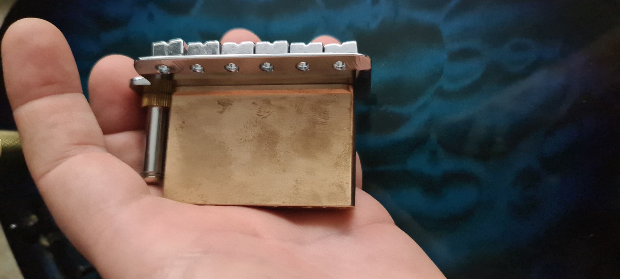 Еще, возможно, эта приспособа задумана для апгрейда гитар с шестиболтовым тремоло. Две свободные дырки как раз под уже имеющиеся отверстия от тремоло, а оставшиеся отверстия будут скрыты под пластиной.