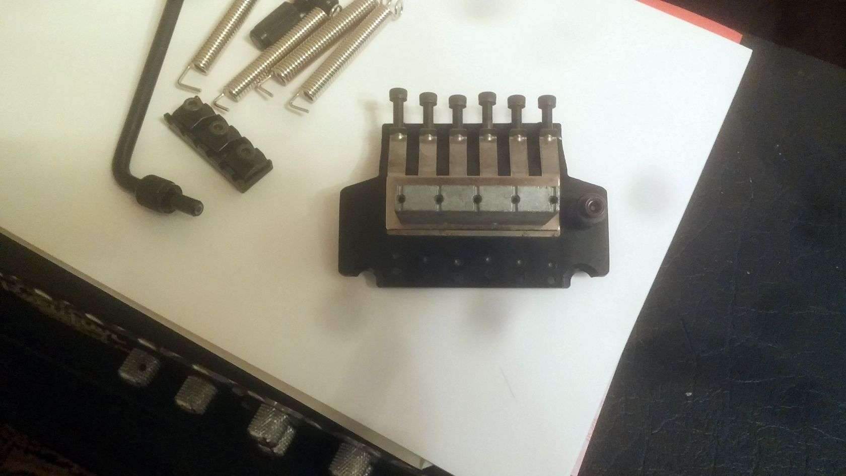 Форма станины как у такеучи, но обычно там рычаг по-другому вкручивался (если брать не низкопрофильные версии) - на манер винтажных тремоло, в сустейн блок, а тут гайка и сустейн блок похож на Gotoh 1996T (и то отчасти). Сёдла как у шаллера/ОФР. Такеучи с заменённым стаканом рычага, сустейн-блоком и сёдлами? Плюс Takeuchi TRS-101 имеет логотипы спереди (либо заказчика, например Jackson, Charvel, либо надпись TRS-101), а тут никаких опознавательных знаков...