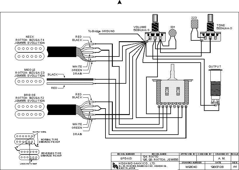 По схеме ибанезовских звучков получается так: белый и красный идут на контакты переключателя, а черный идет на землю потца. Если я понял правильно, то красный=красный, а белый=белый+черный(димарзио), а на землю потца громкости - черный=зеленый+экран(димарзио).
