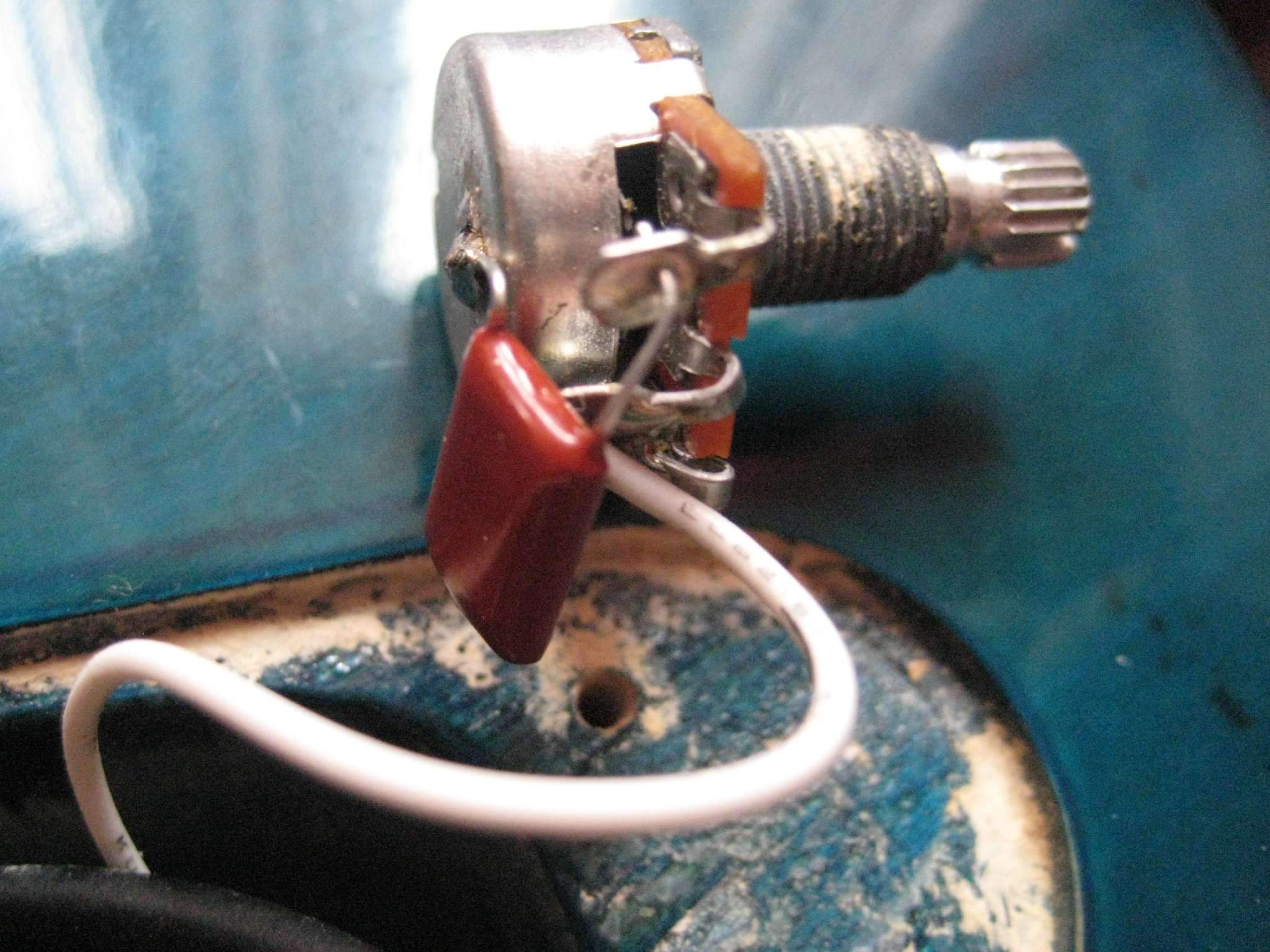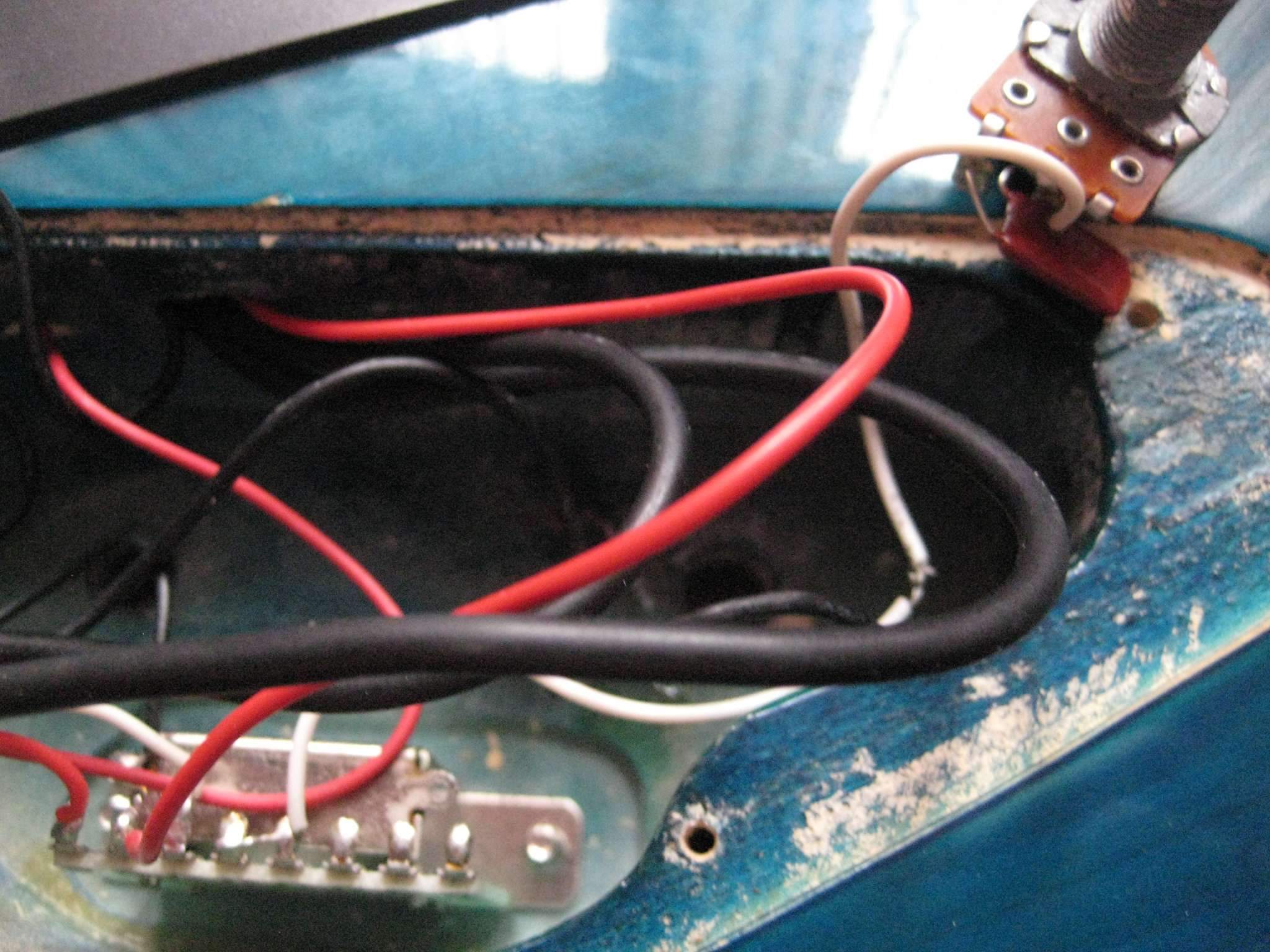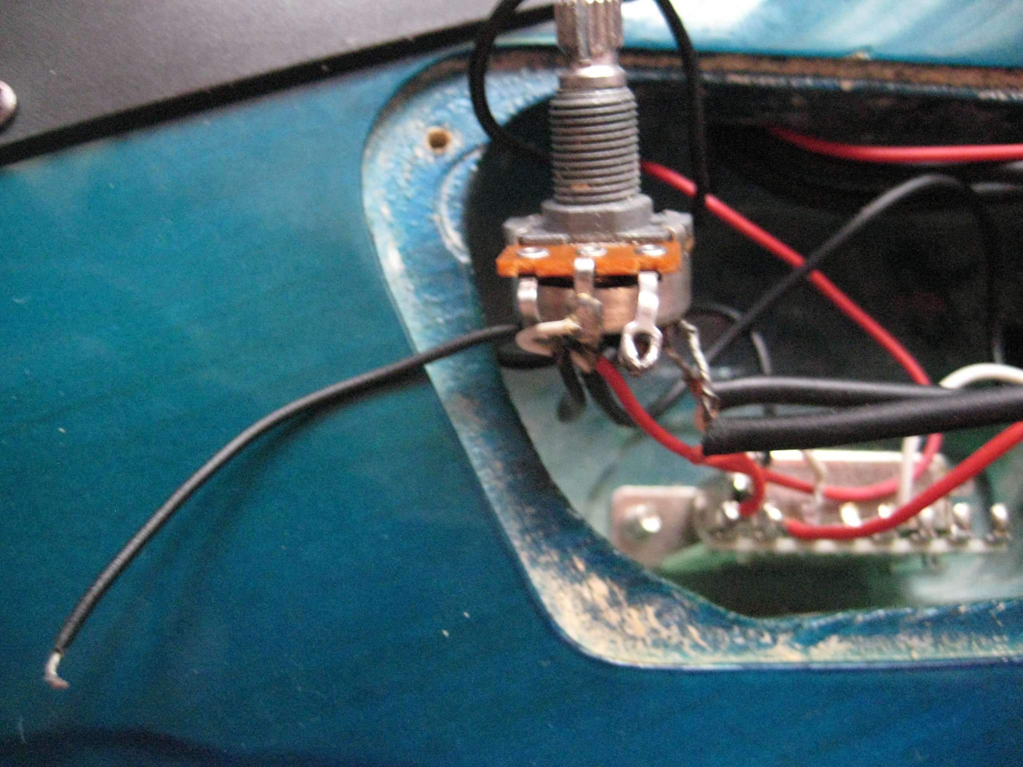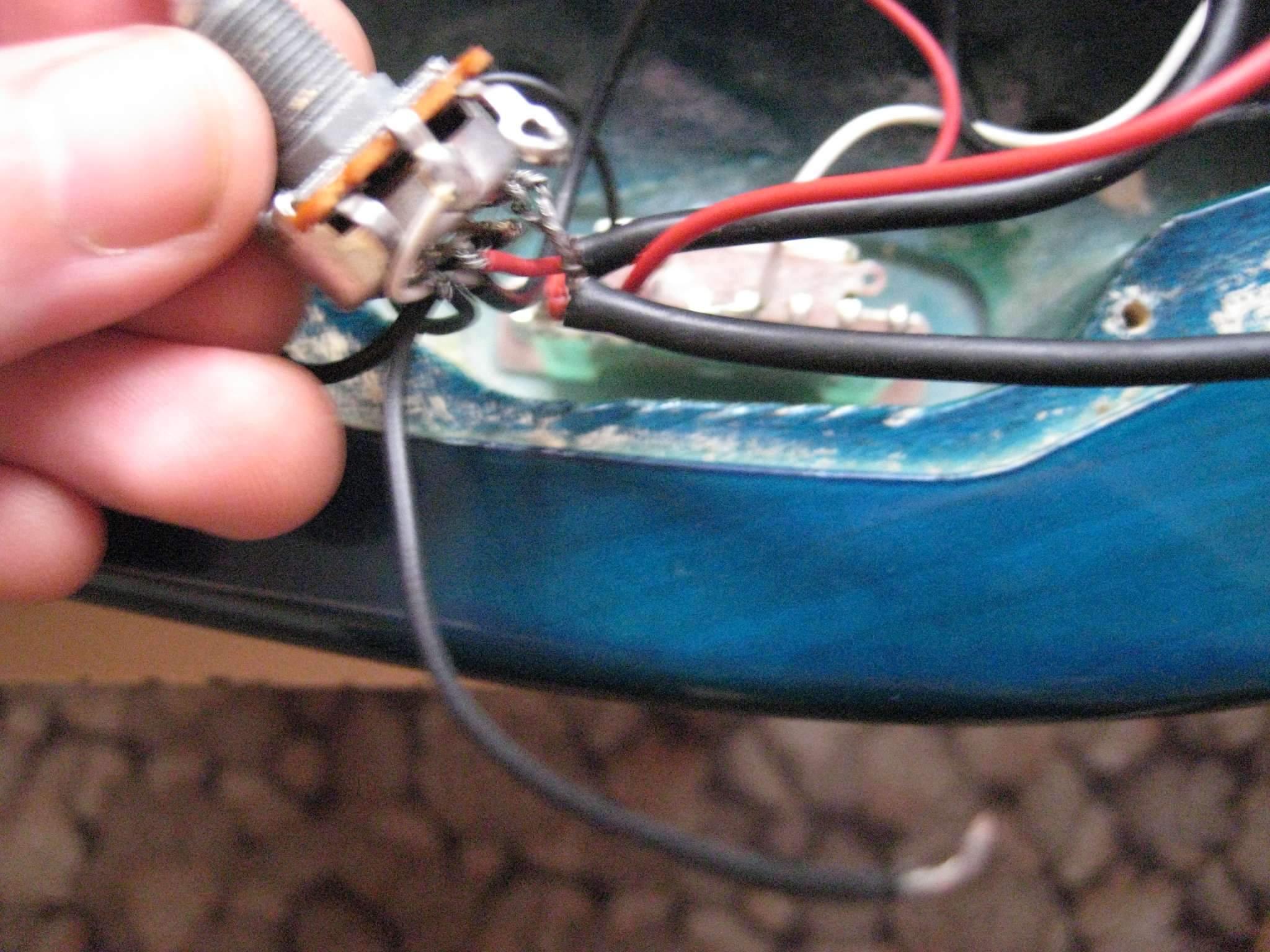 Я прикоснулся пальцем к потенциометру громкости (к отходящей от него свободной ножке), другим пальцем прикоснулся к потенциометру тона - звук появился с фоном и щелчками. Пока лазил - оторвал белый провод. Психанул - вырвал все провода. Меня эта китайская дрянь достала. Куплю новую гитару.