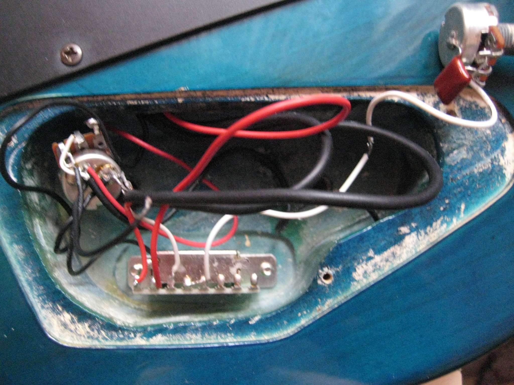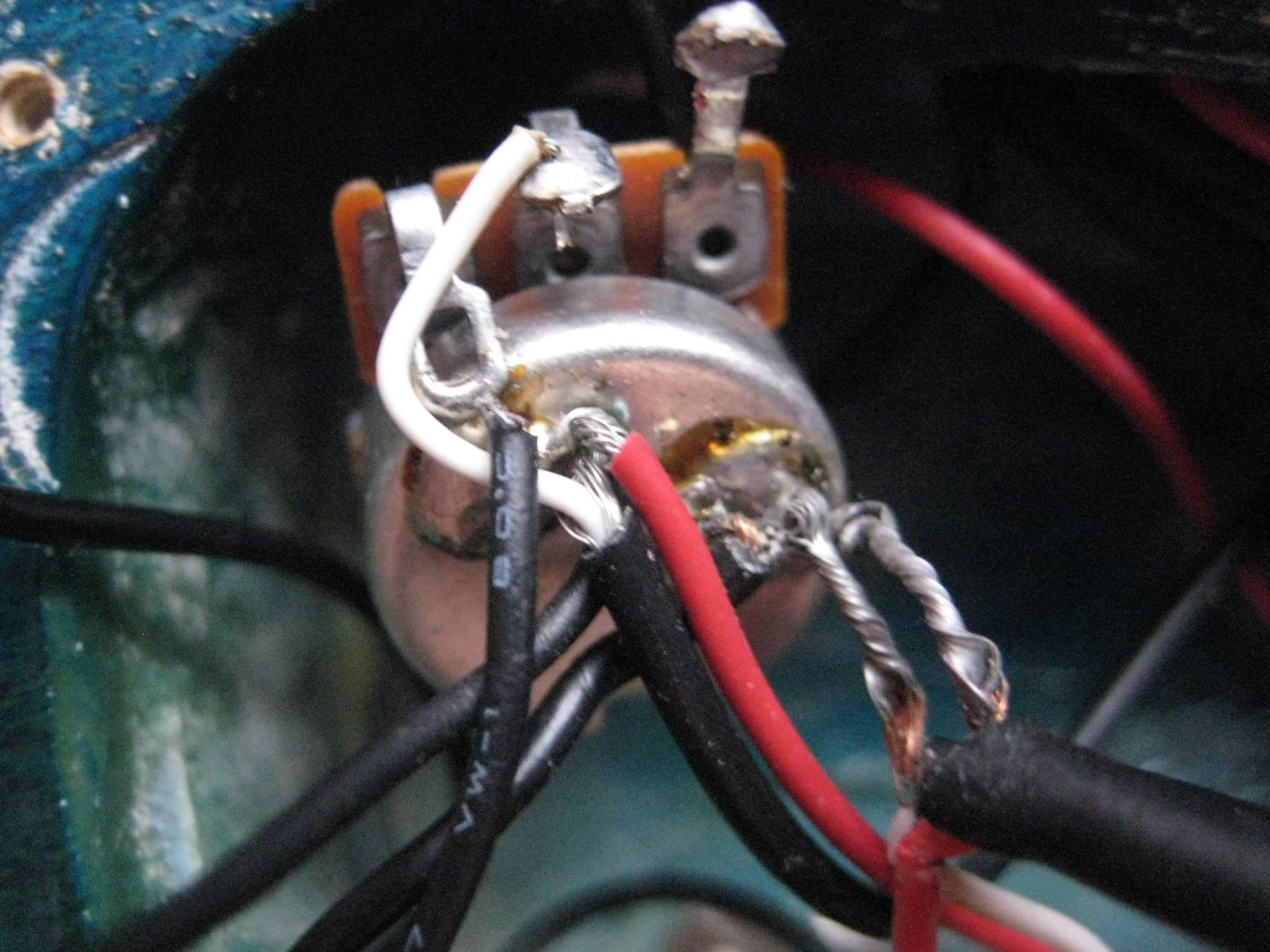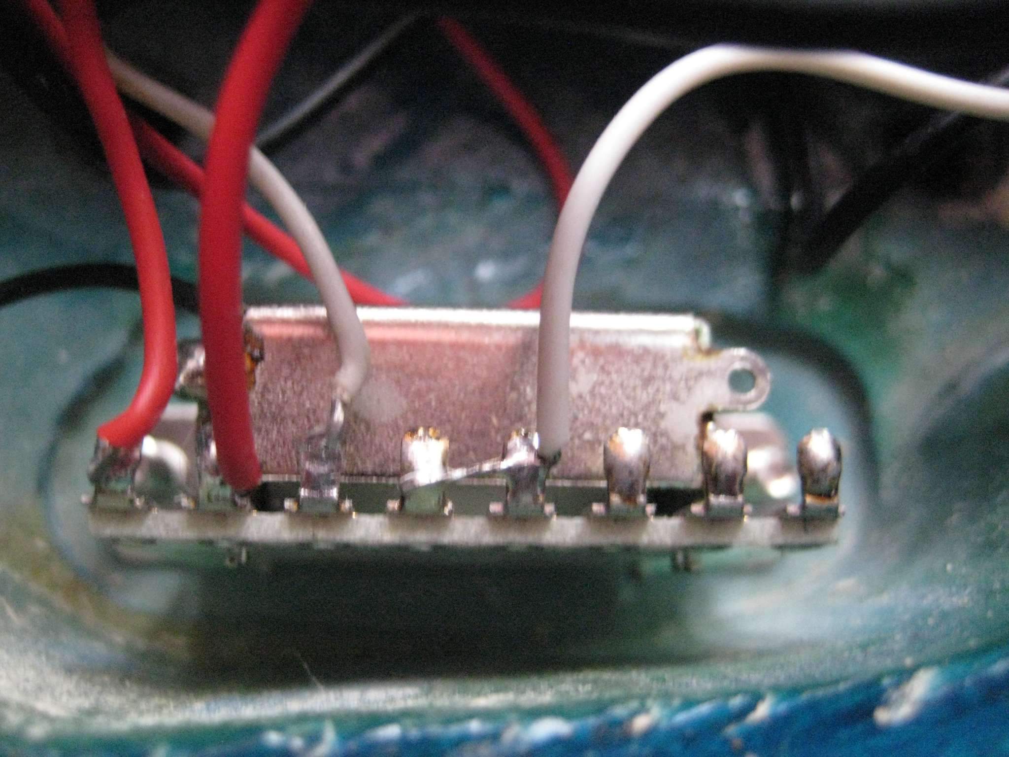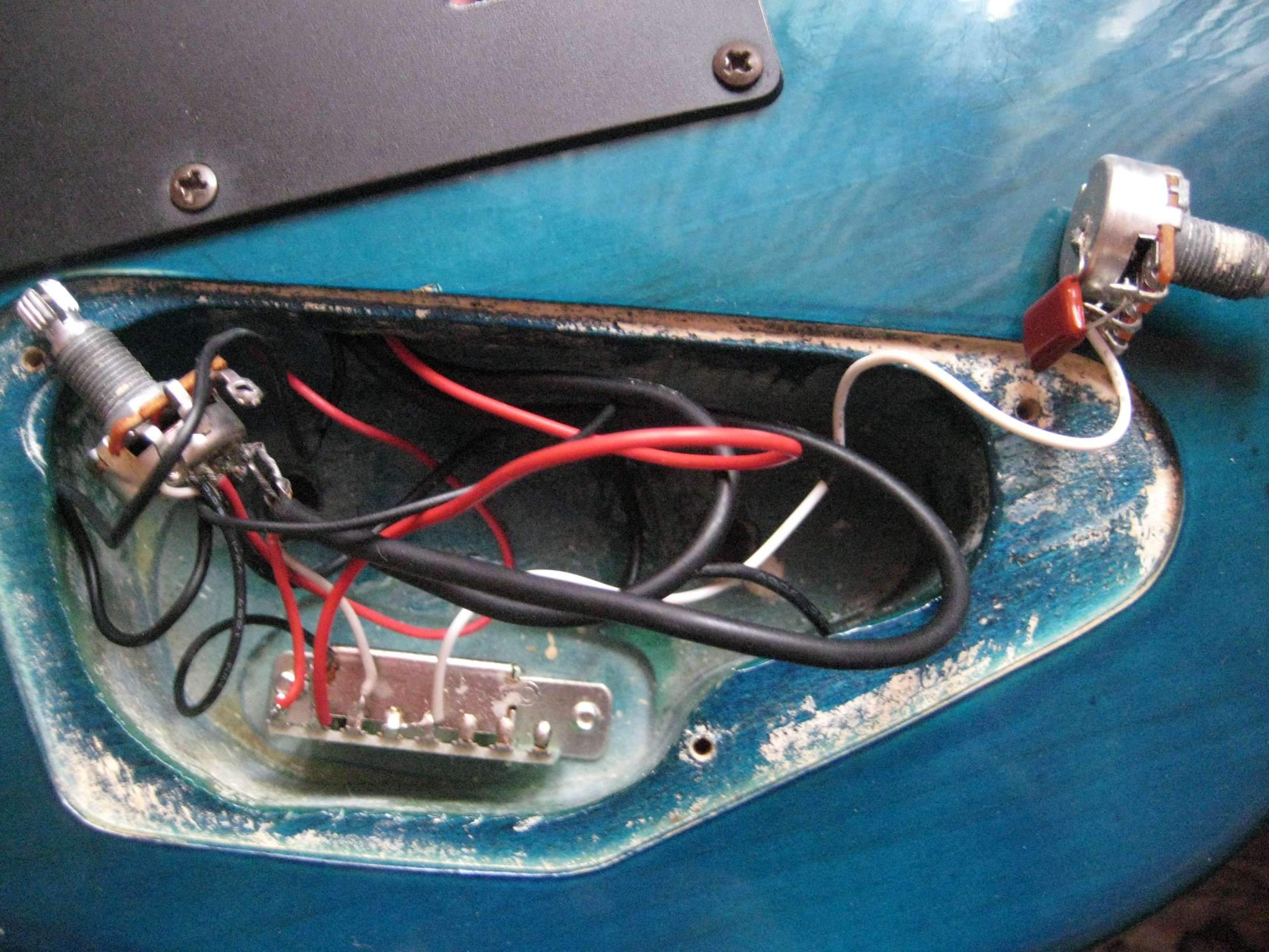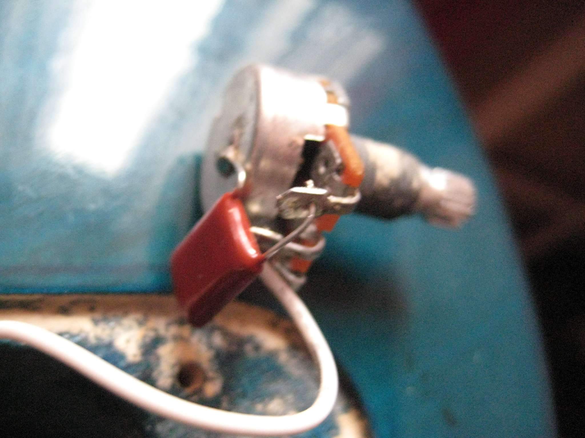 Я прикоснулся пальцем к потенциометру громкости (к отходящей от него свободной ножке), другим пальцем прикоснулся к потенциометру тона - звук появился с фоном и щелчками. Пока лазил - оторвал белый провод. Психанул - вырвал все провода. Меня эта китайская дрянь достала. Куплю новую гитару.