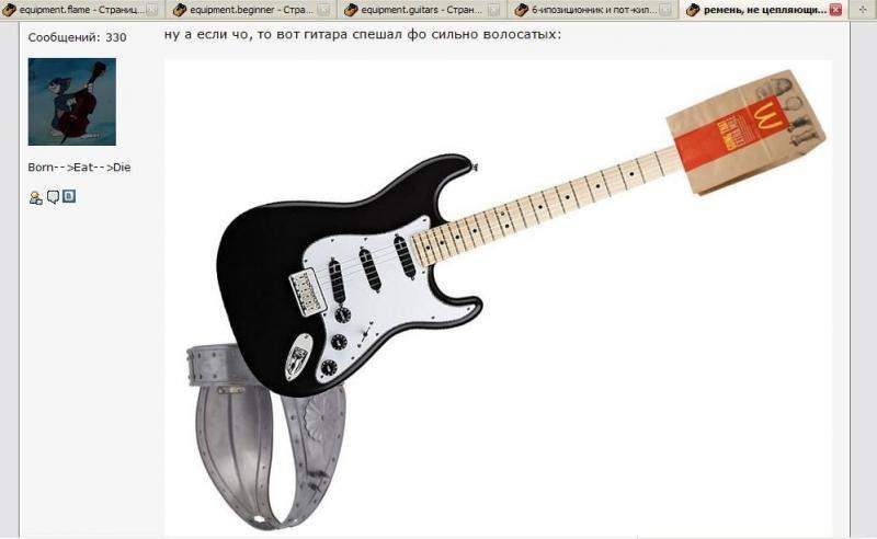 Вам лишь бы поржать)) А тема то действительно о наболевшем, и для многих актуальная! Есть тряпичные ремни с элегантной надписью "Fender" и дермантиновой подкладкой. Прекрасно висит на плече, плотно присаживается. Главное, чтоб патлы, при одевании ремня, под него не попали. А далее все намази)) Но ты знаешь, Beherit, я месяц назад постригся, и, черт побери, патлы риальне перестали доставлять неудобства...)