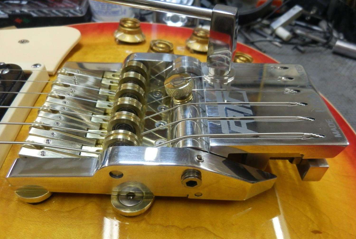 избегая лишнего словоблудия попробую перейти к сути. по тем или иным параметрам мне нравятся инструменты зачастую не относящиеся логически к флойд роузу, но пристратие к нему у меня сильное. посему печали были сильные , что чтобы установить некое подобие из предлагаемых различными производителями тремоло приходится сверлить , дербанить итд итп, но ладно бы это, ещё важнейшая фича флойда - микроподстройка и топ лок , а это уже чуть ли не 50% его сути и как правило отсутствовало в предлагаемом.
