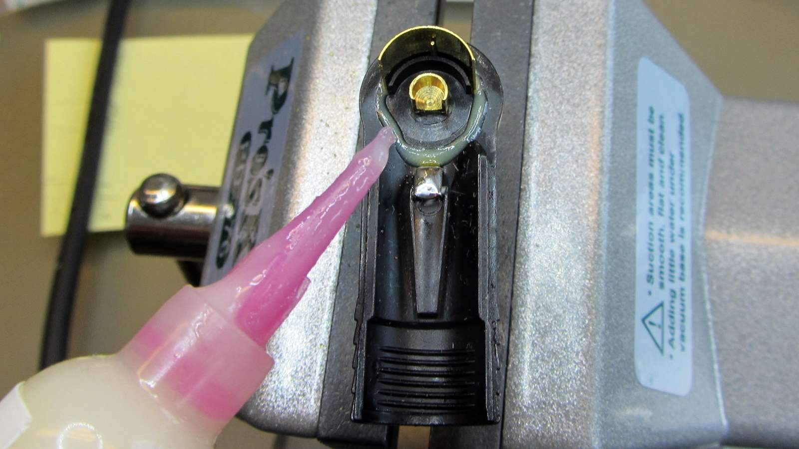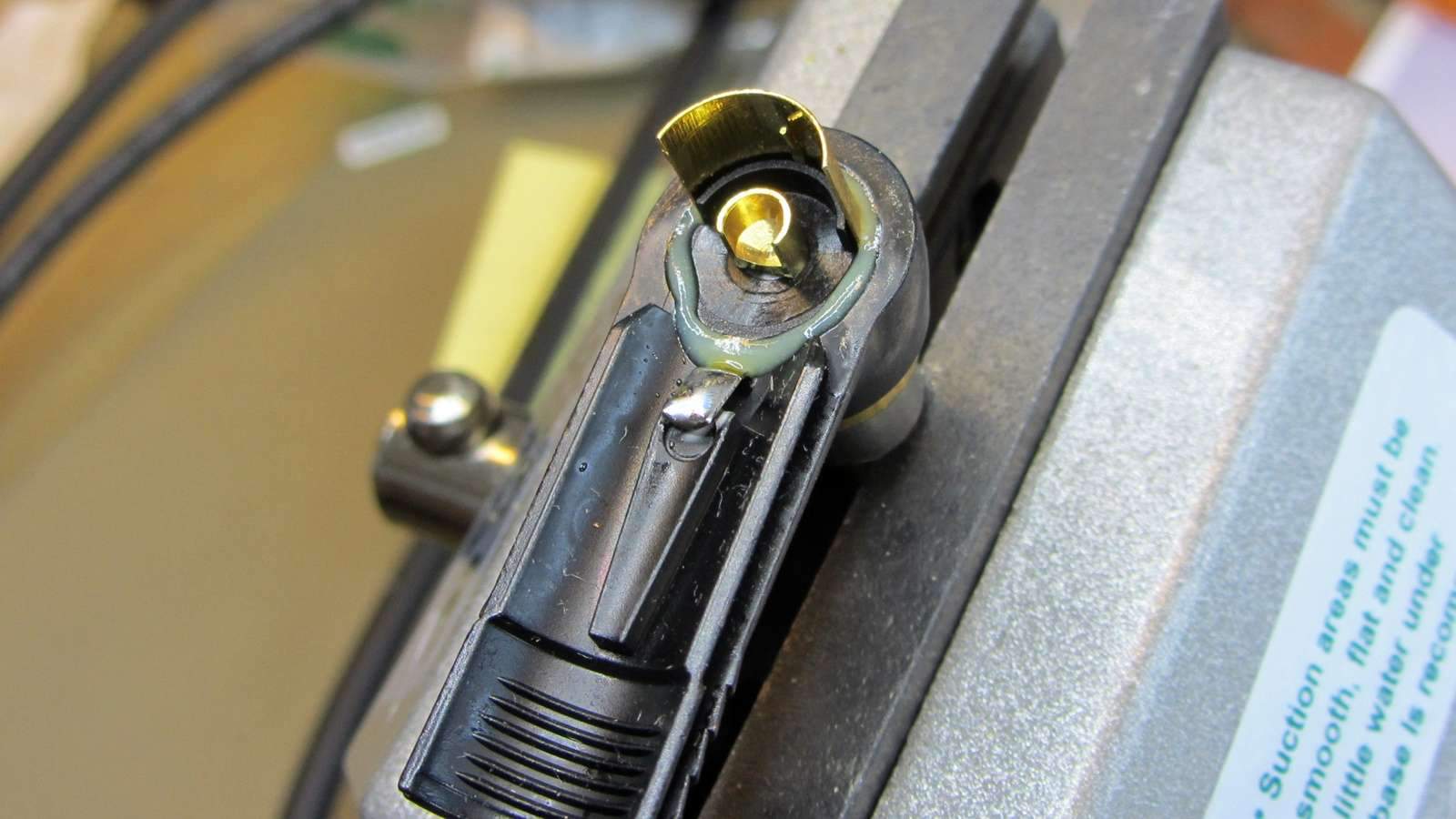 У основания контакта есть белое кольцо, которое уходит назад при включении штекера в гнездо.