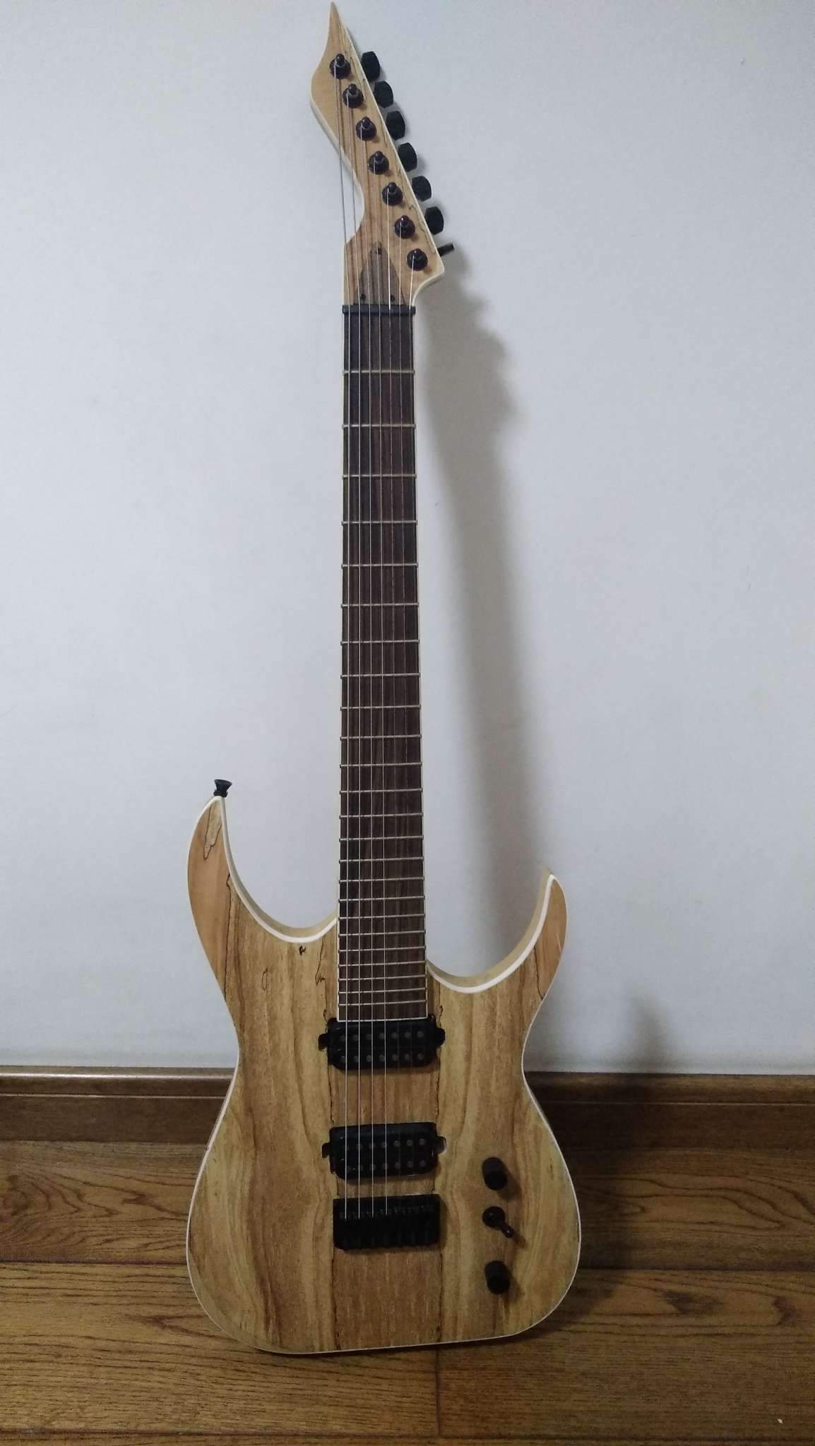 Карман под гриф надо ровнять. В некоторых местах соединения с деталями (колодки под струны, карман грифа) торчат мелкие опилки. Карманы под датчики в некоторых местах выпилены криво. Колок седьмой струны посажен чуть ближе к другому, чем все остальные. Не знаю какой тут стрингспейсинг, но на гитаре как будто стоят не f-spaced датчики, тонкие струны находятся не над сердечниками магнитов, что на звук не влияет.