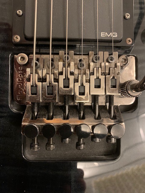 За 27 лет гитаризма мне ни разу не доводилось держать в руках гитару с флойдом. Я просто никогда даже не смотрел в их сторону, пользуясь исключительно стартами от Fender и Charvel. По этой простой причине я совершенно ничего не понимаю во флойдах. Но сегодня мне волею случая досталась гитара (можно сказать, что за стоимость кейса, в котором она находится). Но даже и на эти деньги я бы лучше купил три упаковки по х24 банки пива, если бы инструмент не был таким удивительно звучным, ровным и очень "флажолетным". На гитаре не играли 11 лет потому, что она "не строит". Хозяин-долпойопп, пытаясь настроить мензуру делал все в точности наоборот. И, когда ему уже не хватило хода седел вперед, он проточил паз, где флойд упирается в стойку. Теперь флойд упирается в дерево деки... Понятно, что это уже не лечится (ни флойд, ни бывший хозяин). Я мензуру выставил (хотя теперь пришлось выбрать почти весь ход назад), гитара строит идеально по всему грифу. И вот, после долгого вступления у меня три вопроса:
