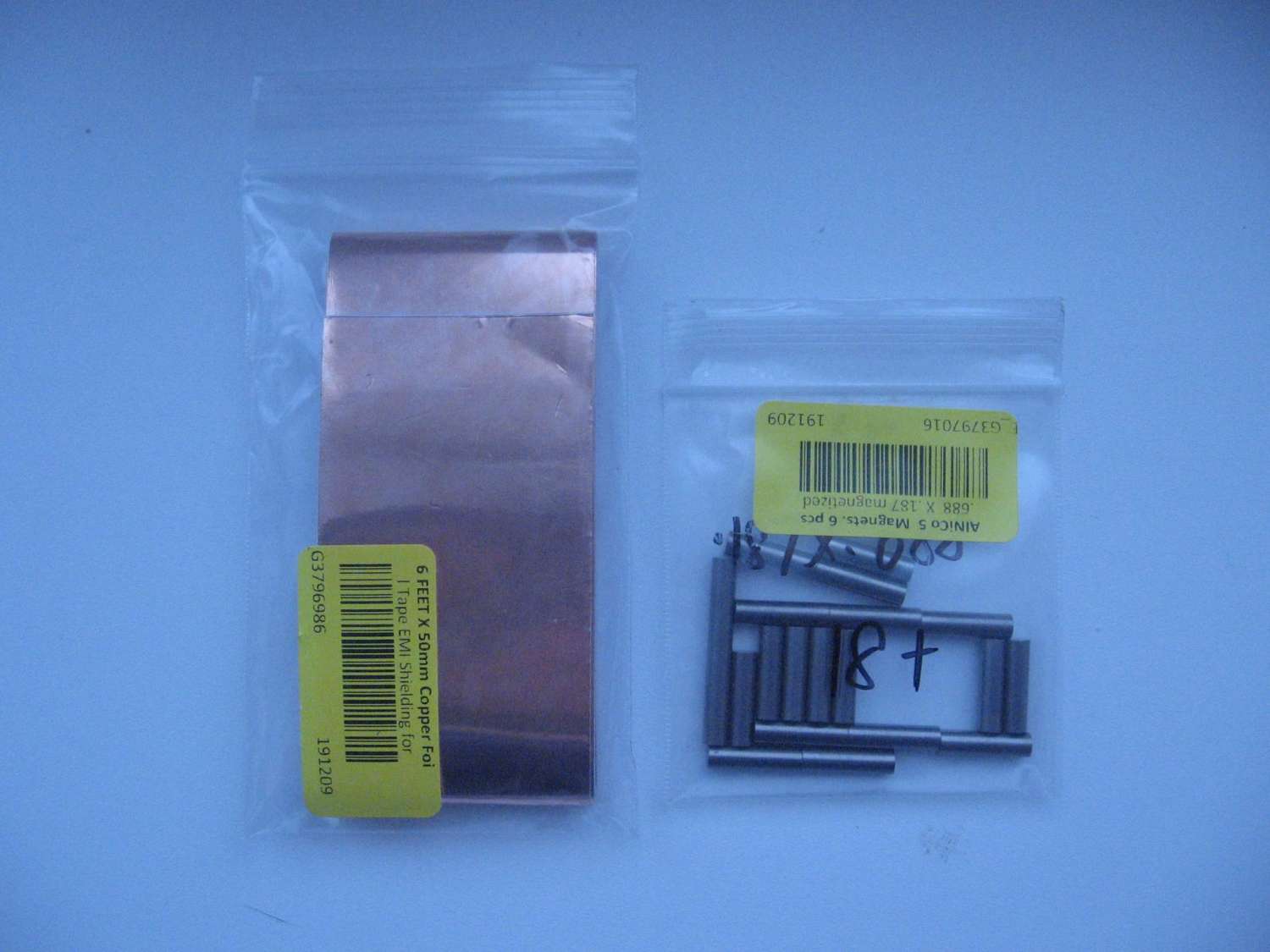 Когда купил своего Фендера Стратокастер, мексеканской крови, я был очень рад, притом моя кровь была подогрета двумя неделями ожидания его с Америки. Фото с ебея стало явью и при сравнении с моим прошлым самиком, гетара пела. Время шло и захотелось, что то, улучшить слабым звеном в моей гитаре, как мне показалось, стали датчики, у меня три сингла. Так как у меня мекс 2002 года, у меня стоят дешевые датчики, где стальные стержни, намагничены двумя магнитами снизу. Как я знаю у более молодых мексеканцев, стоят датчики с магнитными сердечниками AlNiCo5, плюс у них сделана графитовая экранировка, чего не было у меня. Связи с этим я решил поискать потраха от американца, но поиски не дали мне успеха, все просили большую цену. Так же, новые синглы били по карману, что я не мог себе позволить. Было решено попробовать поменять магниты. После поиска на том же ебей, нашел в свободной продаже нужные магниты при этом, можно было купить любой сплав, как AlNiCo5, так и AlNiCo2 и другие. Не стал экспериментировать и купил AlNiCo5, как в стандартных, размер магнита .688 X .187, за одним заказал медный скотч с тока проводящим клеем для экранировки гитары. За все с доставкой отдал 1200р, при этом, два магнита подкинули в подарок. Как заменить магниты подсмотрел здесь