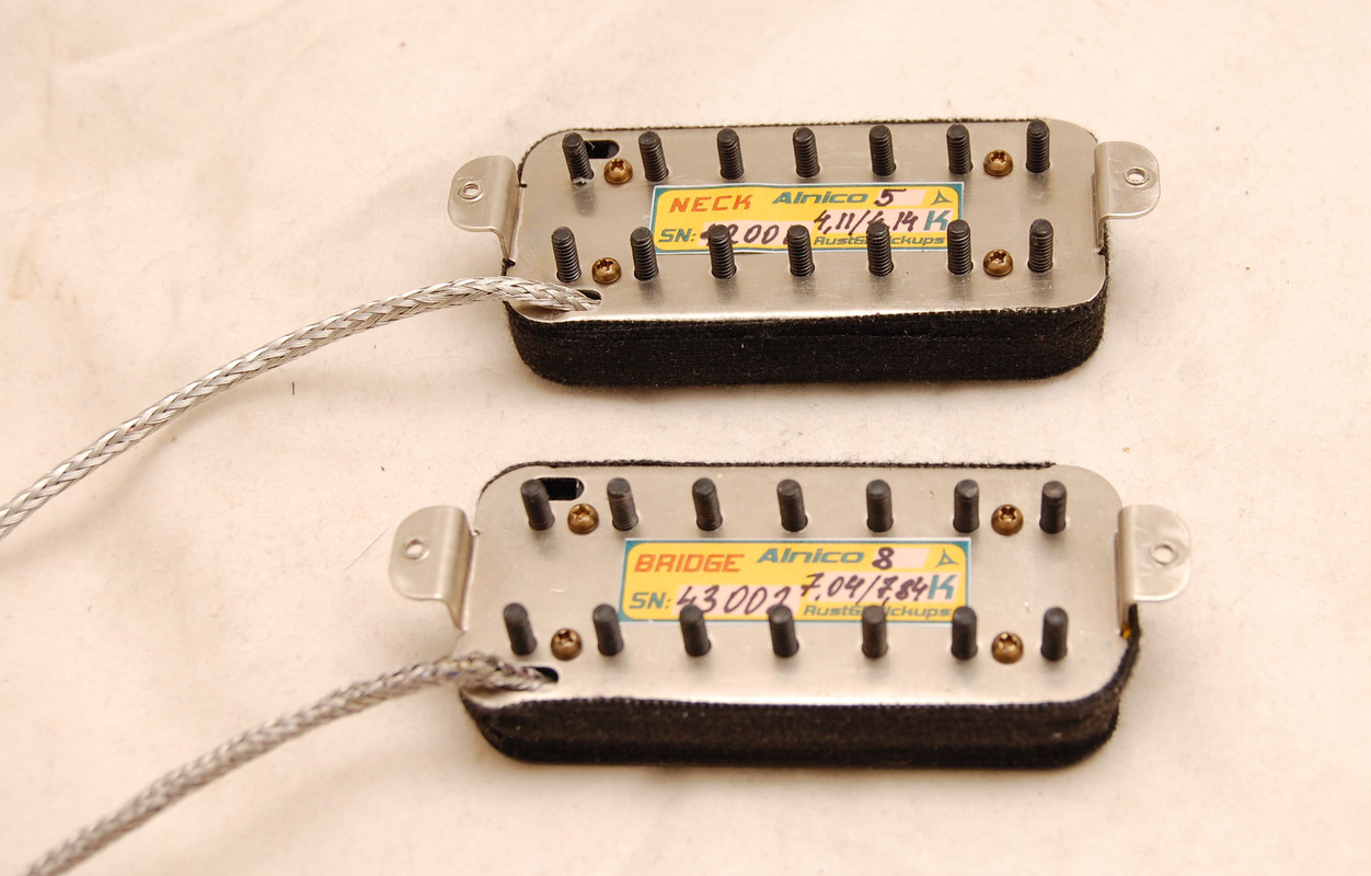 Alnico 5 Vintage Staggered, намоточный провод 1956 г. СССР, изоляция Formvar, натуральный пчелиный воск, экранировка медной фольгой. Выводящий многожильный авиационный провод, цвет небесно-голубой, чистое серебро, экранировка серебряная фольга. Военная приемка, применяется в SU-35, изоляция из несгораемых материалов.