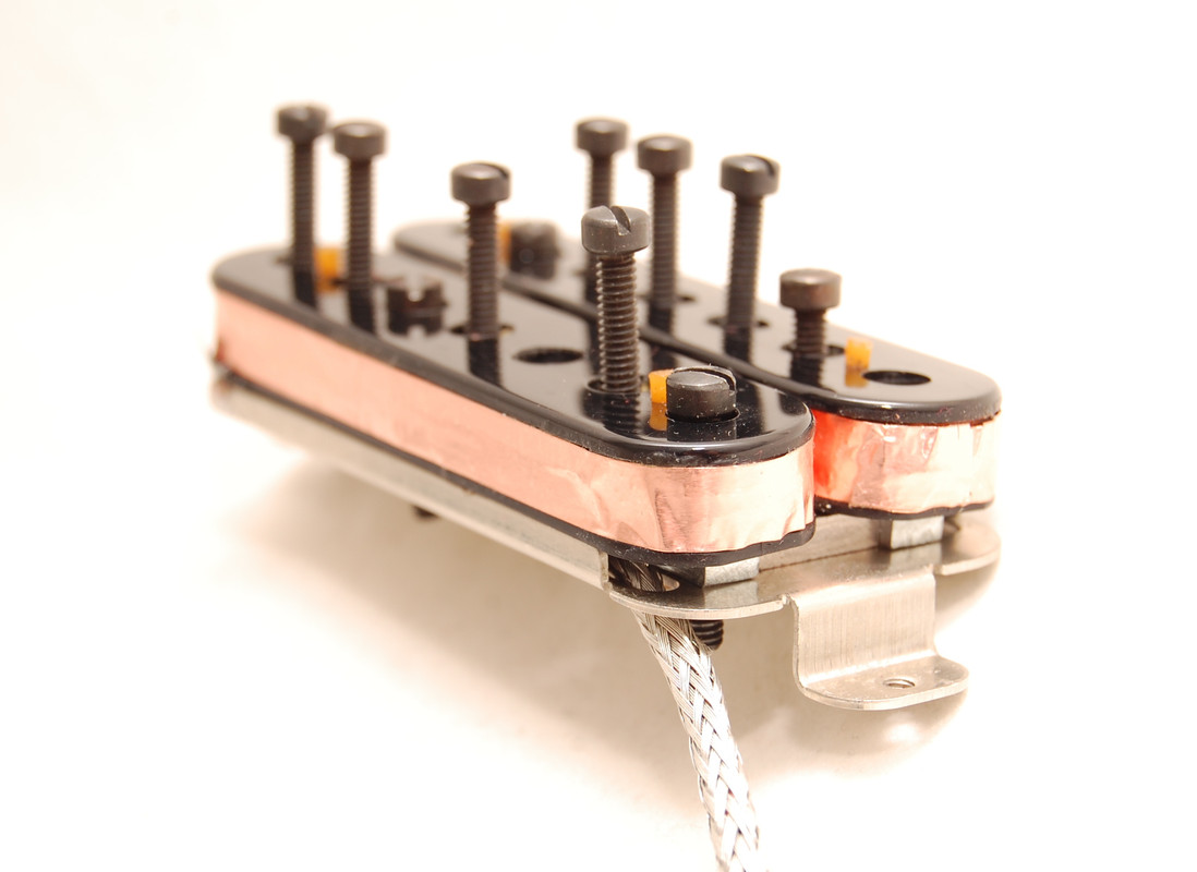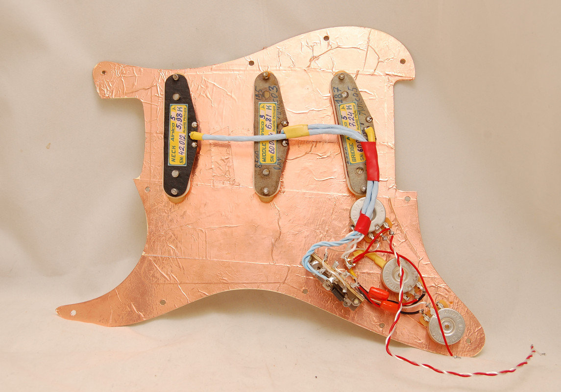 Alnico 5 Vintage Staggered, намоточный провод 1987 г. СССР, изоляция Эмаль, натуральный пчелиный воск, экранировка медной фольгой. Выводящий многожильный авиационный провод, цвет небесно-голубой, чистое серебро, экранировка серебряная фольга. Военная приемка, применяется в SU-35, изоляция из несгораемых материалов.