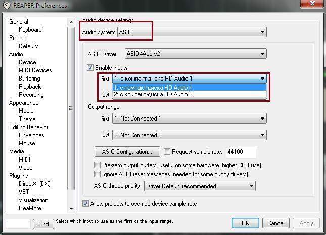 ... и добавил:Разобрался с программой.. Но с драйвером Asio Reaper не хочет писать с линии. А без Asio большая задержка звука.