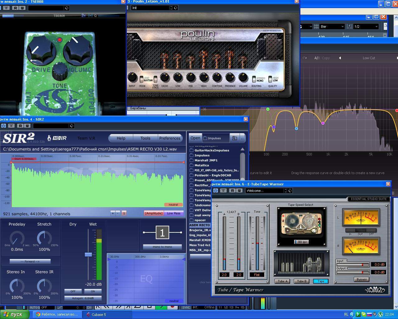 DanLAGUNA, Пасиб.)_ Да, блин, с барабанами, хрен получится.)) В силу тормознутости моего компа, в чём виноват я сам и никто иной, я не могу себе позволить обрабатывать ударную установку поканально, приходится наобум всё делать. В дальнейшем думаю хотя бы бочку и рабочий отдельно делать, хотя основной минус не в них.