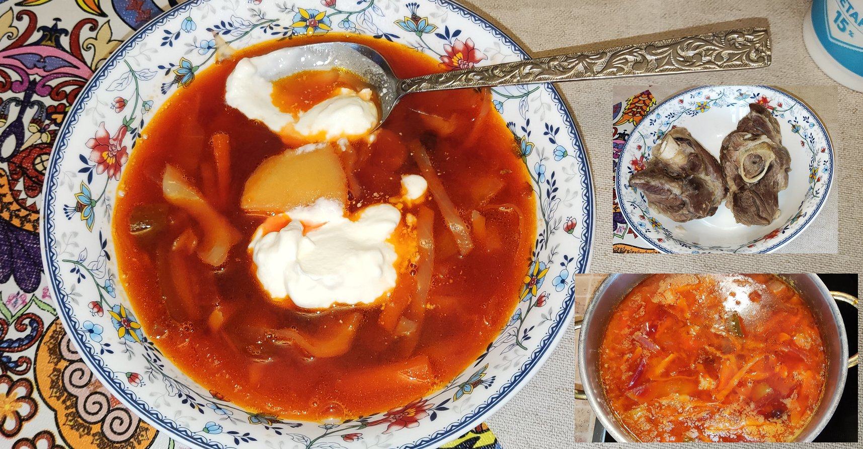 Состав на всякий случай: кроме свёклы и баранины ещё капуста 2-ух видов - обычная свежая и квашенная с морковью, картофель отварной (вчера остался от ужина) - положил в конце самом, красная фасоль - целая банка, лук, чеснок, морковь, томатный соус, душистый горошек, лавровый лист, оливковое масло, солёные огурцы - остался один из тех, что для оливье покупались.
