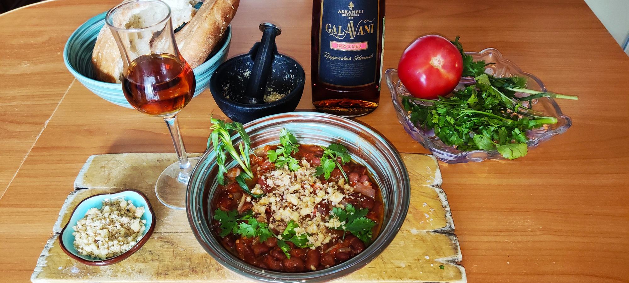 Отварил фасоль (90 минут), поджарил лук, подготовил в миксере смесь из перцев, томатов и кинзы, вылил в жареный лук, добавил в сковороду свежий чеснок, 2 чайных ложки аджики, щепотка хмели-сунели, перемешал, потом добавил отварную фасоль.