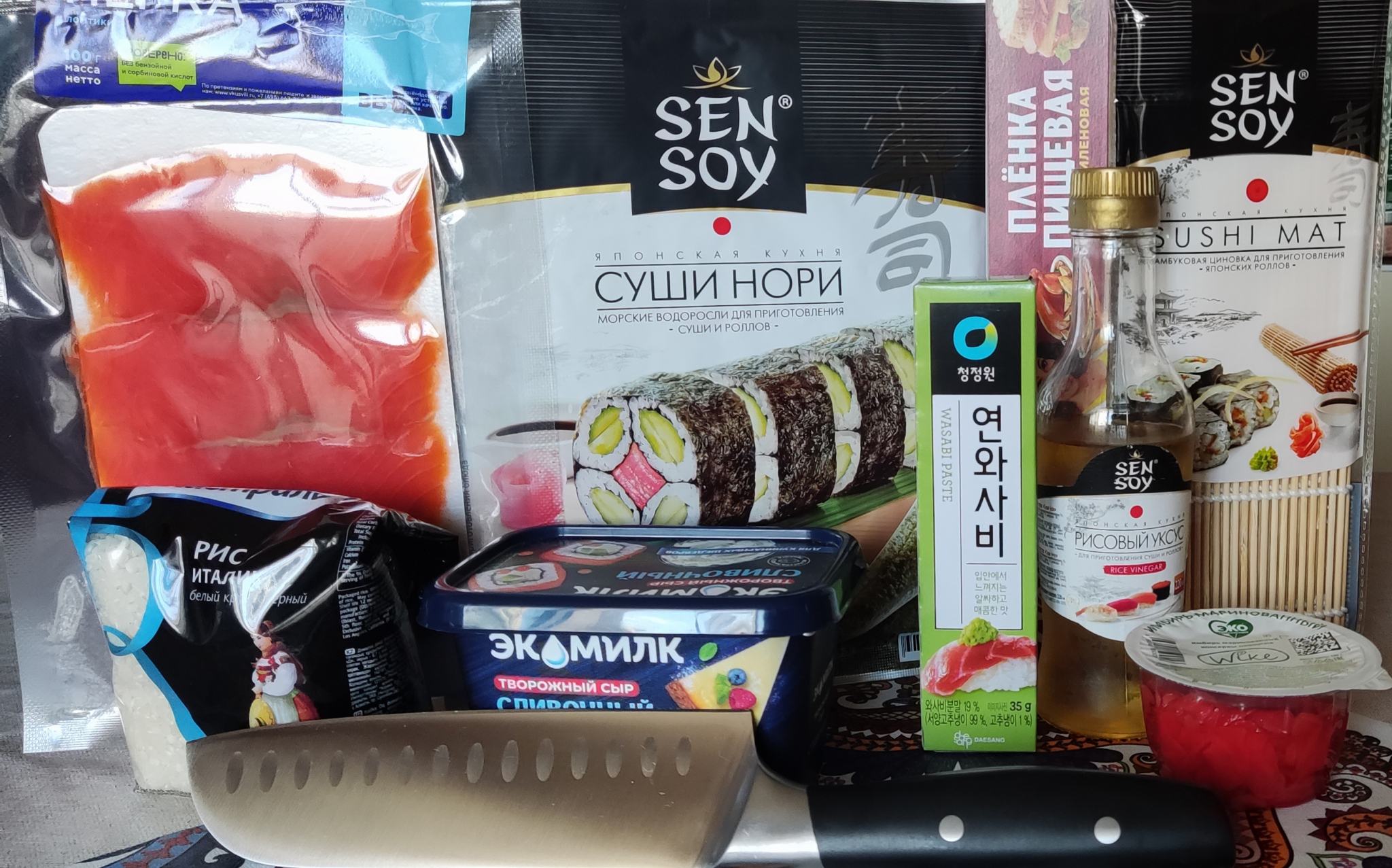 Так получилось, что рис и рисовый уксус - единственное, что специально не покупал к данному мероприятию. Рис недавно купил со скидкой для паэльи, а уксус рисовый купил 2 года назад на пробу, понял, что ни для чего не пригождается - стоял всё это время в холодильнике.