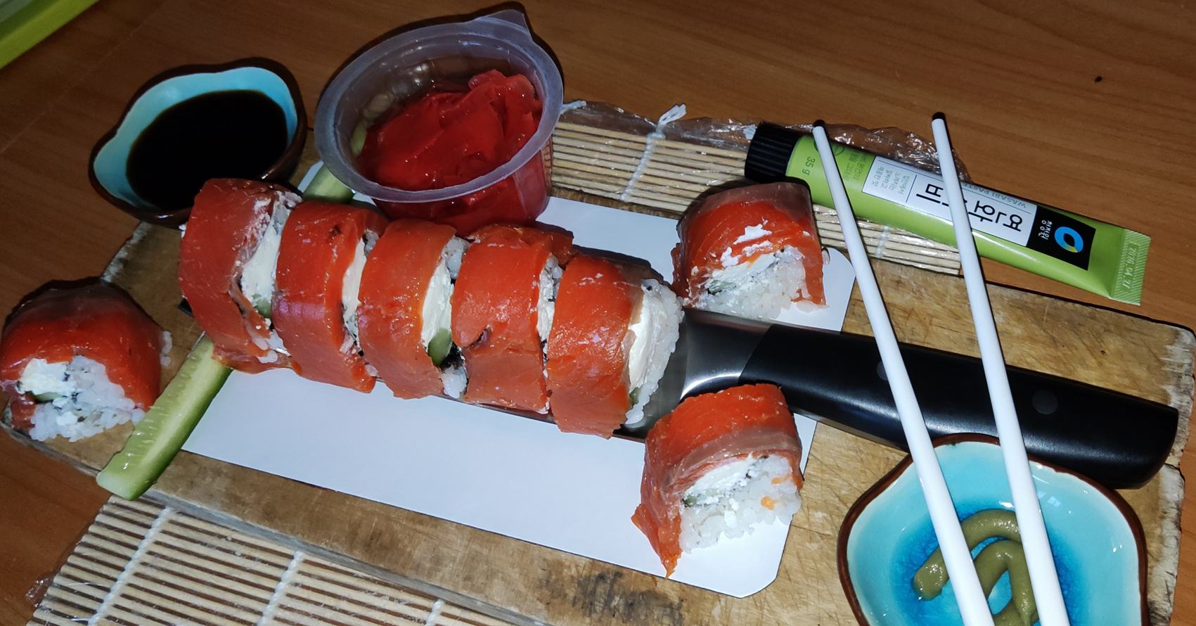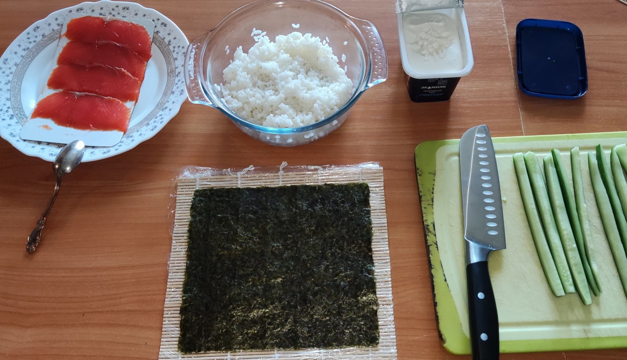 В общем, сердцевину у огурца убрал, рис сварил, остудил, с уксусом смешал, коврик плёнкой обмотал, лист знаю, что нужно пополам сложить, использовать только часть, пока для красоты. Боюсь дышать....