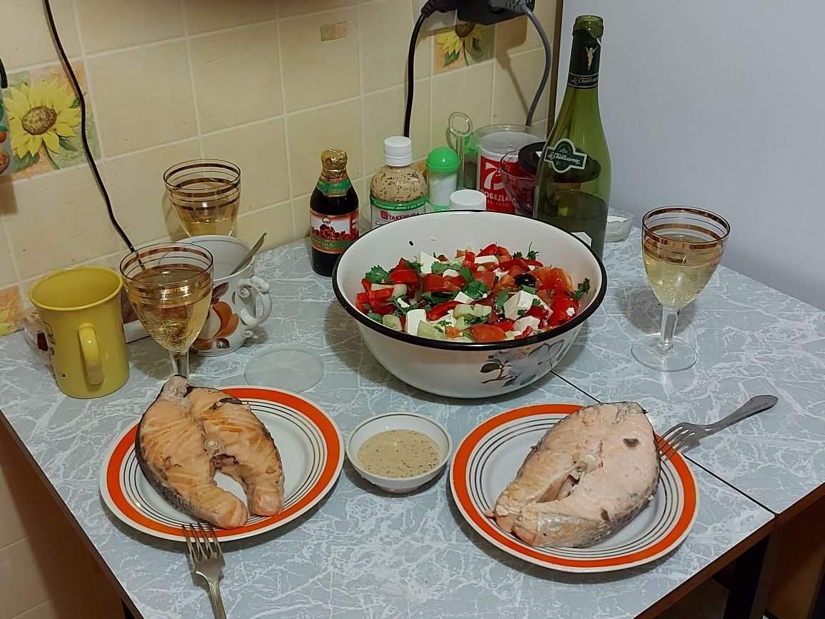 ... и добавил:Как и обещал - стейк из лосося(естественно, кусочков несколько). Два вида соуса. А к рыбе - Шаблиз!
