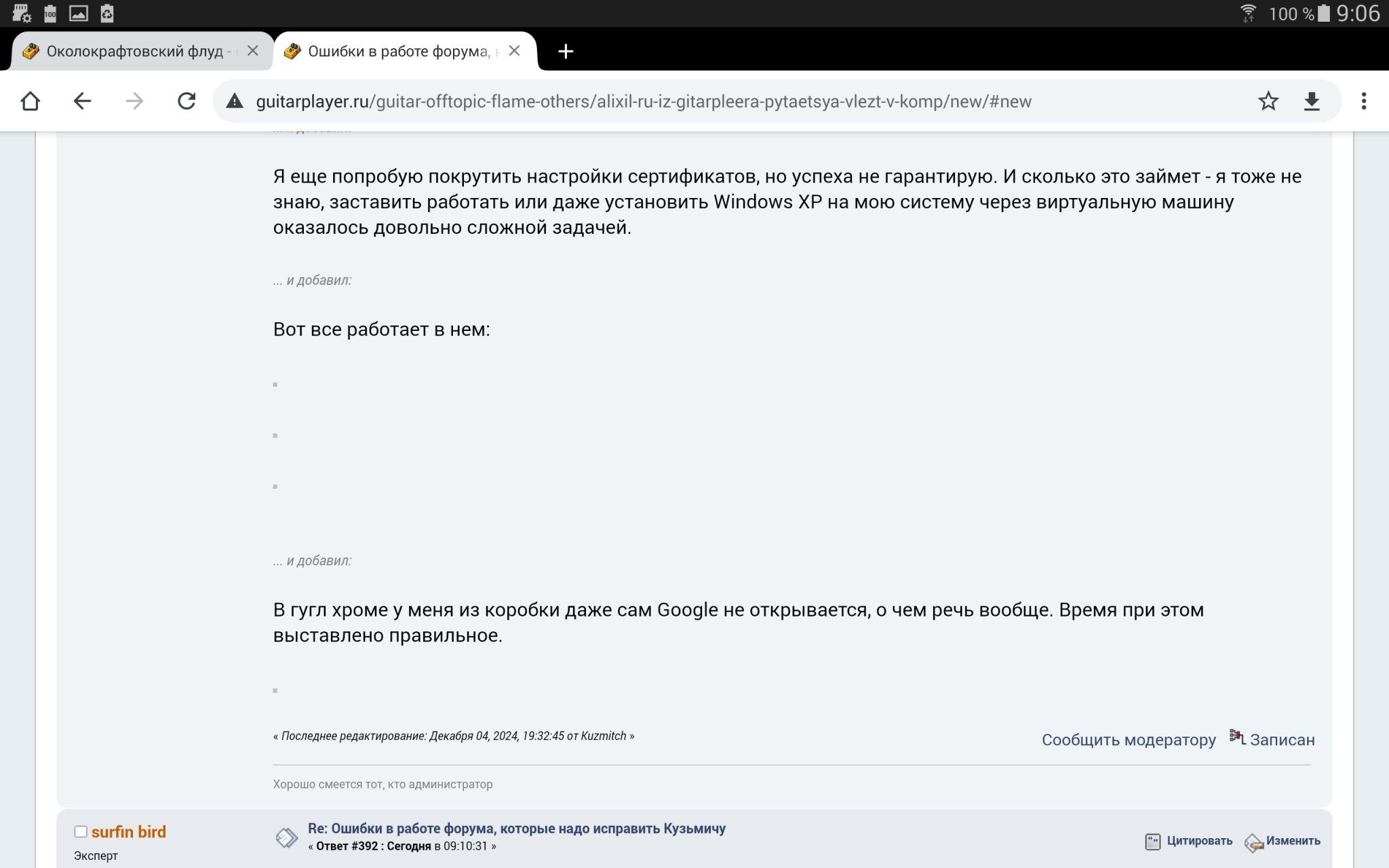 https://forum-img.guitarplayer.ru/2024/12/04/uMg3m.png... и добавил:У меня грустные новости по поводу Windows XP, устаревших андроидов, и старых браузеров. Дело в том, что когда переезжали на новый сервер, была установлена последняя версия операционной системы Debian 12, из которой уже выкушены старые протоколы ниже версии TLSv1.2, и что бы я ни делал с настройками сертификатов в nginx, поддержки этой не будет:
