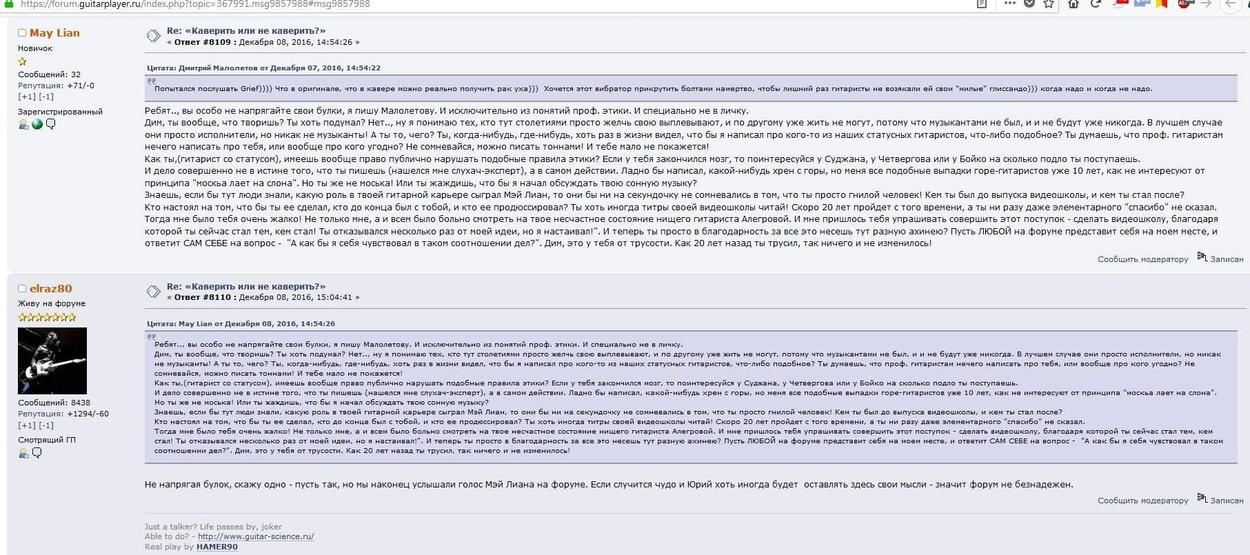 А вообще, я все эти рифы и идеи в новом сольнике слушал - они музыкальны и прекрасны, для любого кто любит хард-рок. Да, многое на альбоме чище, чем в жизни, а убойность рифов обеспечивает второй гитарист (Слэш никогда и не скрывал, что ему нужен ритмач, еще со времен Стрэдлина). Но сам материал, идеи и музыкальность прут в том числе от Слэша, и его харизмы. И насколько Фродо смехотворный здесь, может мне не дано просто понять красоту рифов от препода с 15-летним стажем... Но от любой "возни" от Слэша есть желание прислушаться, есть ощущение движения рифа, несмотря на косяки исполнения. Появляется желание взять гитару и поинрать. От щечла Фродо ничего появляется, от его музыки у меня появлялось только желание выключить это, и не тратить даже своё время. Сколько бы он не исходил на навоз, в сравнении со Слэшем он грустный унылый антимузыкальный нолик. Но я могу понять, что ему еще и жанр хард-рока не близок, ну не умеет за почерком и буквами видеть прекрасные фразы, чтоб составить в воображении историю. Для него это чуждо, не его жанр скорее всего, но зачем в гопника гитарного превращаться... В какой-то момент он и сам поверил, что говорит это Слэшу непосредственно)))