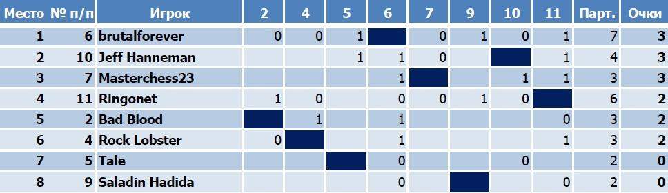 ... и добавил:Masterchess23, Джефф и брутал - хорошие игроки. В турнире я им обоим проиграл, правда, я экспериментировал. В ответном матче -реванше обыграл брутала, но это так, неофициально.