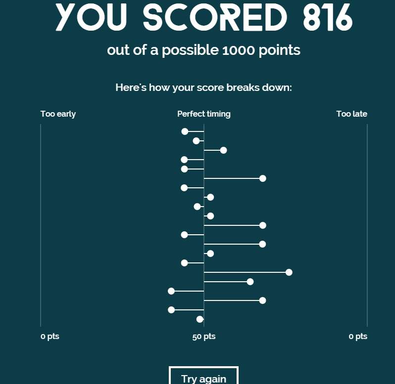 The track plays at 120 beats per minute, which means a beat plays every 500 milliseconds. Your score represents how close you were to the correct timing.