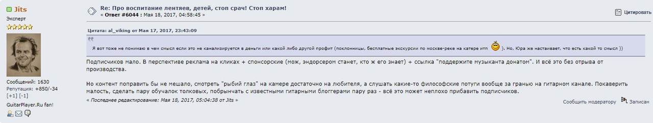 Со скрина орнул. Получается, я в 2017 году Юрку на путь наставил. Донатики, эндорсмент, рыбий глаз Юрбан таки убрал, обучалки запилил. Правда, побрынчать с другими блоггерами не сумел, так как понимал, что слеза вдоль бедра потечет. Но зато сумел срач затеять, что, в принципе, с точки зрения внимания с соседнего канала тоже ничего. Вот я Масон, канешн