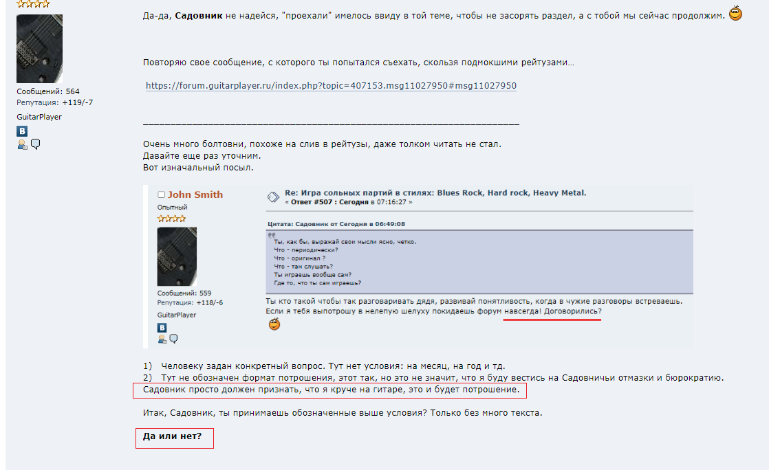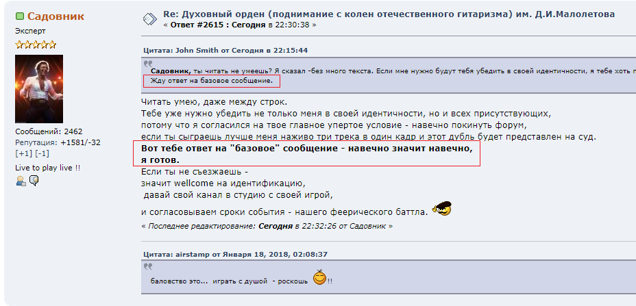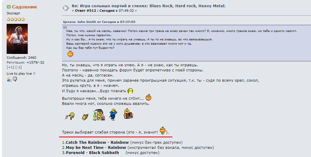 Вот в этом сообщении Садовник сам признает себя слабой стороной и на этом основании требует для себя льготные условия исполнения, а именно композиции, которые ему уже знакомы.