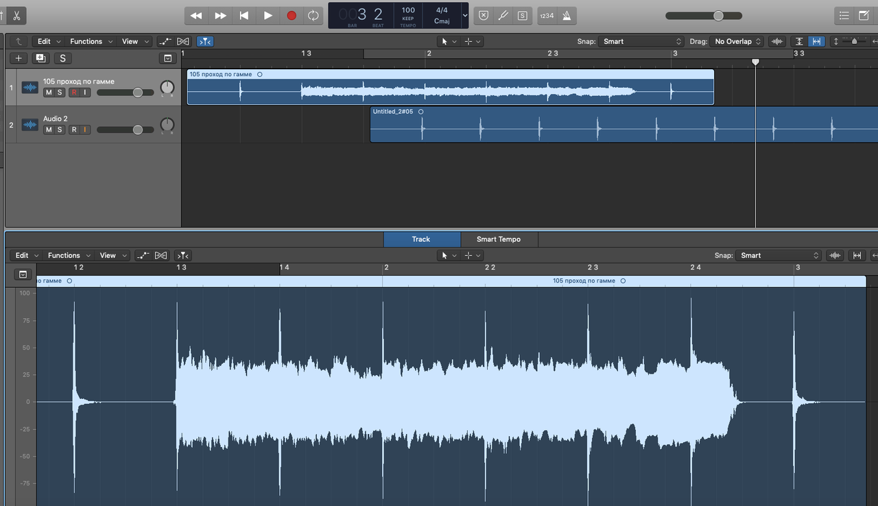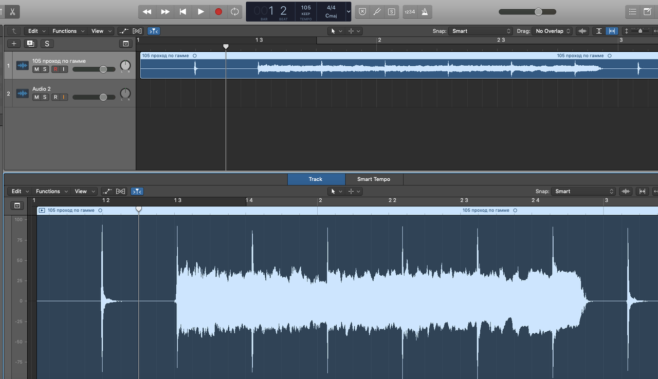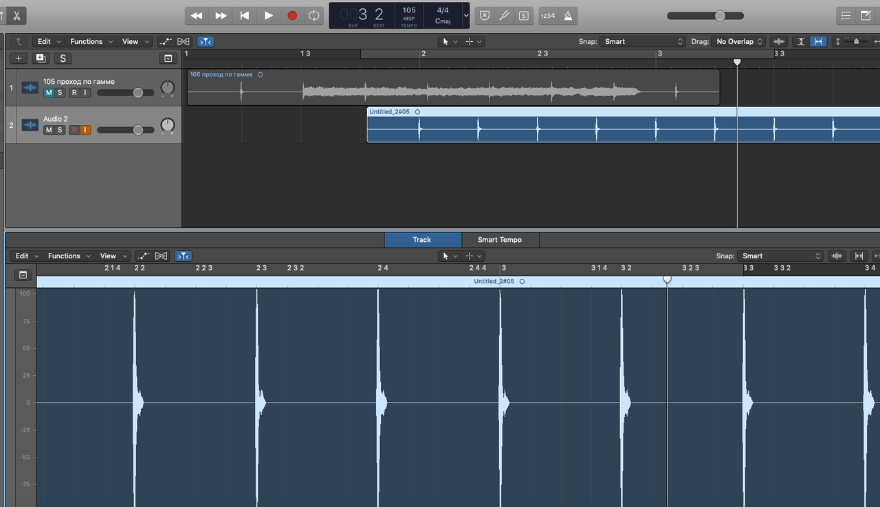 Второй нюанс ещё более хитрый. Я решил приколоться и записал поверх твоей хрюшки-виртушки свою в терцию от ноты Ми. Но, что-то пошло не так. Я профан в записи и даже не сразу сообразил в чём дело... И поверь, я тебя не обвиняю - может быть это я что-то делаю не так. Но тем не менее. Записав дорожку поверх твоей в темпе 105 - я обнаружил, что они не совпадают. Моя играет заметно быстрее